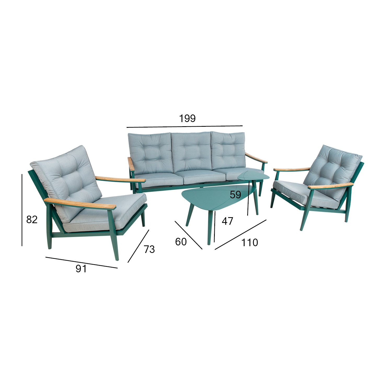Aiamööblikomplekt CAVINE laud, diivan ja 2 tugitooli, roheline. Huvitav värvilahendus, 2-tasandiline diivanilaud ja tiigipuust liistud annavad komplektile omapära. Kõigi komplekti osade põhikonstruktsioon ja lauaplaat on valmistatud alumiiniumist ja viimistletud rohelise pulbervärviga. Paksud padjad tagavad suurepärase istumismugavuse. Padjakatted on valmistatud väga hea ilmastikukindlusega olefin kangast. Komplekti kuulub 3+2 istmepatja 63x63x10cm ja 3+2 seljatoepatja 68x68x10cm. Istmepatjade katted on lukuga suletavad, eemaldatavad ja pestavad. Seljatoepatjade katteid ei ole eemaldatavad. 3-kohalise diivani mõõdud on 199x91xH82cm, tugitooli mõõdud 73x91xH82cm, istme kõrgus raan ääreni on 32cm, koos padjaga 42cm. Laua mõõdud on 110x60xH47/59cm. Toode on muutlikes ilmastikutingimustes väga hästi vastupidav ja lihtsalt hooldatav. Kaitset ilmastikuolude eest vajavad ainult padjad. Välitingimustes kasutatava mööbli eluea pikendamiseks soovitame kasutada välimööbli katteid. HOIUSTAMINE: suvehooaja lõppedes soovitame aiamööblit hoiustada siseruumides. Puhastage ja kuivatage mööbel enne hoiule panekut. Kasutage hoiustamiseks kuiva ning hea ventilatsiooniga ruumi.