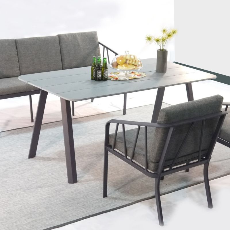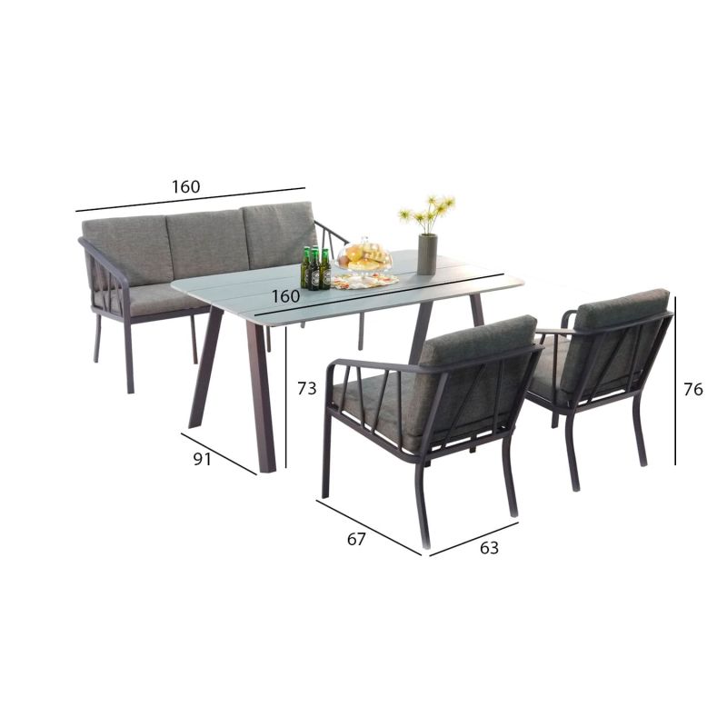 Aiamööblikomplekt KAHLA laud, diivan ja 2 tooli, hall. Diivani ja toolide raamid, lauajalad ja alusraam on valmistatud alumiiniumist ning kaetud lillakashalli pulbervärviga. Lauaplaat: hall lamineeritud kunstpuit (4 paneeli 1600x223x15mm). Laua mõõdud on 160x91xH73cm. Tooli mõõdud on 63x67xH76cm, istmepadi 57x54x6cm, seljatoepadi 57x40x6cm. 3-kohalise diivani mõõdud on 160x67xH76cm, istmepadi 3tk – 51x54x6cm, seljatoepadi 3tk – 51x40x6cm. Padjakatted on valmistatud hallist olefin kangast. Toode on muutlikes ilmastikutingimustes hästi vastupidav ja lihtsalt hooldatav. Kaitset ilmastikuolude eest vajavad ainult padjad. Hea lahendus patjade igapäevaseks hoiustamiseks ja kuivana hoidmiseks on padjakast. Välitingimustes kasutatava mööbli eluea pikendamiseks soovitame kasutada välimööbli katteid. HOIUSTAMINE: suvehooaja lõppedes soovitame aiamööblit hoiustada siseruumides. Puhastage ja kuivatage mööbel enne hoiule panekut. Kasutage hoiustamiseks kuiva ning hea ventilatsiooniga ruumi.