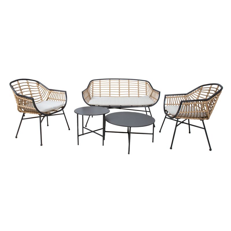 Aiamööblikomplekt LUNDE diivan, 2 tooli ja 2 lauda. Mugava vormiga diivani ja toolide raamid on valmistatud terasest ja viimistletud musta pulbervärviga. Naturaalset rotangit meenutav õhuline plastikpunutis annab istmetele stiilse ja omanäolise välimuse. Istmepadjad kuuluvad komplekti. Padjakatted on valmistatud bee˛ist polüesterkangagast. Laudade plaadid ja alusraam on valmistatud terasest ja viimistletud musta pulbervärviga. 2-kohalise diivani mõõdud on 140,5x64xH85cm, tooli mõõdud on 64x64xH85cm, laudade mõõdud on D70xH35cm, D50xH45cm. Toode on muutlikes ilmastikutingimustes hästi vastupidav ja lihtsalt hooldatav. Kaitset ilmastikuolude eest vajavad ainult padjad. Välitingimustes kasutatava mööbli eluea pikendamiseks soovitame kasutada välimööbli katteid. HOIUSTAMINE: suvehooaja lõppedes soovitame aiamööblit hoiustada siseruumides. Puhastage ja kuivatage mööbel enne hoiule panekut. Kasutage hoiustamiseks kuiva ning hea ventilatsiooniga ruumi.