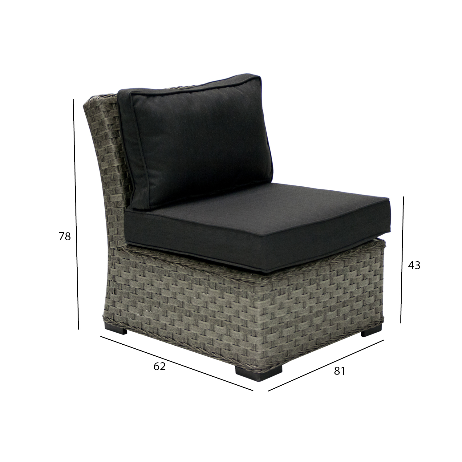 Diivani vahemoodul GENEVA 62x81xH78cm, hall. Mooduldiivan on suurepärane võimalus luua sobiva kuju ja suurusega istumiskoht, mida on lihtne muuta ja ümber paigutada. Diivani raam on valmistatud alumiiniumist ja kaetud plastikpunutisega. Padjakatted on valmistatud hallist polüesterkangast. Istmepadja mõõdud on 62x63xH10cm, seljatoepadja mõõdud 65x45x10cm. Lukuga suletavad padjakatted on eemaldatavad ja pestavad. Istme kõrgus raami ääreni 33cm, koos padjaga 43cm. Toode on muutlikes ilmastikutingimustes hästi vastupidav ja lihtsalt hooldatav. Kaitset ilmastikuolude eest vajavad ainult padjad. Välitingimustes kasutatava mööbli eluea pikendamiseks soovitame kasutada välimööbli katteid. Moodulite ühendusklambrid ei kuulu komplekti. HOIUSTAMINE: suvehooaja lõppedes soovitame aiamööblit hoiustada siseruumides. Puhastage ja kuivatage mööbel enne hoiule panekut. Kasutage hoiustamiseks kuiva ning hea ventilatsiooniga ruumi.