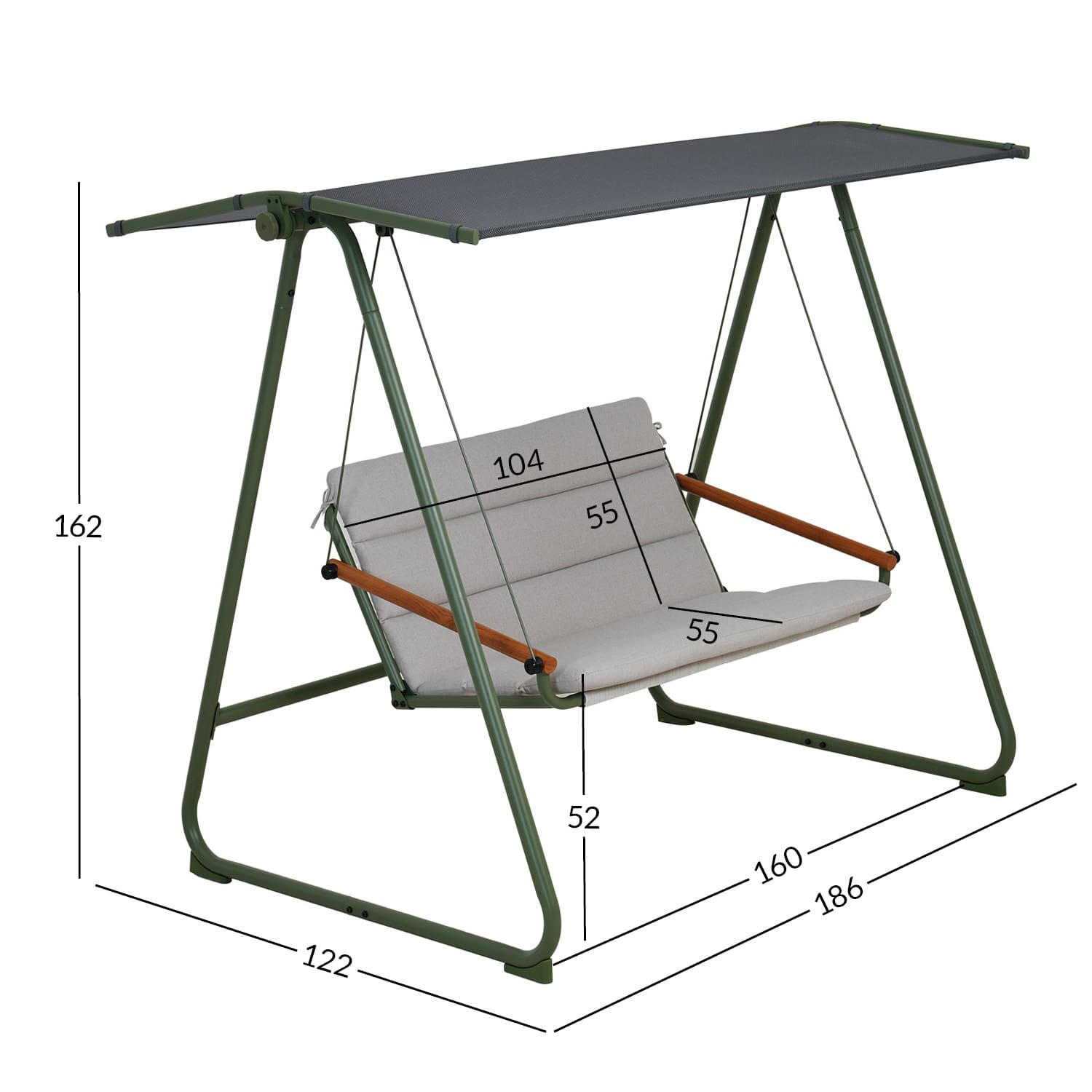 Raami laius 160cm. Kiige istme laius 104cm, istme sügavus 55cm, istme kõrgus 52cm, seljatoe kõrgus 55cm.