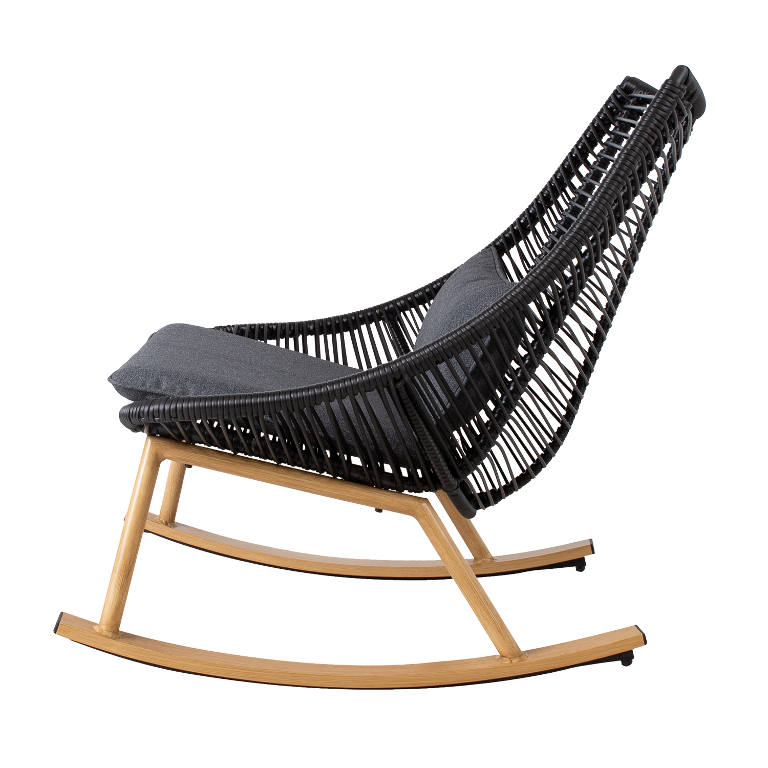 Kiiktool HELSINKI must. Kiiktool pakub mugava võimaluse aeg maha võtta ja lõõgastuda. Tooli istmeosa on kaetud musta plastikust nöörpunutisega. Komplekti kuuluvad pehmed ja mugavad padjad. Toolipadjad on kaetud tumehalli polüesterkangaga. Tooli alumiiniumist alusraam ja jalad on värvitud tiikpuidu tooni. Kiiktooli mõõdud on 84x102xH97cm.