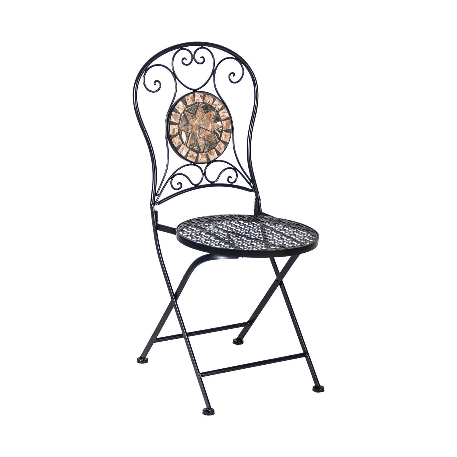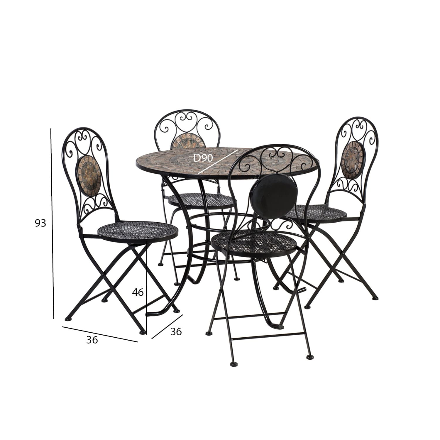 Aiamööblikomplekt MOSAIC laud ja 4 tooli. Laua mosaiikplaat ja kokkupandavate toolide seljatoed on kaunistatud pruunides ja hallides toonides keraamiliste plaatidega. Laua ja toolide jalad ja raam on valmistatud metallist ja viimistletud musta pulbervärviga. Laua mõõdud on D90xH70cm. Tooli üldmõõdud on 40x51xH90cm. Istme laius 38cm, istme sügavus 38cm, istme kõrgus 46cm. Kaalupiirang 90kg. Tooli mõõdud kokkupanduna on 40x103x11cm. HOOLDUS JA HOIUSTAMINE: metallist mööbel on praktiliselt hooldusvaba, piisab regulaarsest puhastamisest. Suvehooaja lõppedes soovitame aiamööblit hoiustada siseruumides. Puhastage ja kuivatage mööbel enne hoiule panekut. Kasutage hoiustamiseks kuiva ning hea ventilatsiooniga ruumi.