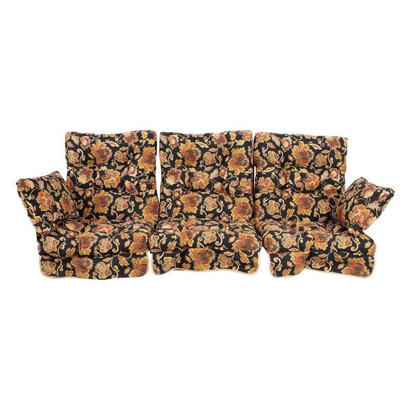 Kiigepadjad ROMA, lilled mustal taustal. Kangas 380, 100% polüester. Ühe padja mõõdud: laius 56cm, pikkus 108cm, paksus 10cm. Komplektis 3tk.