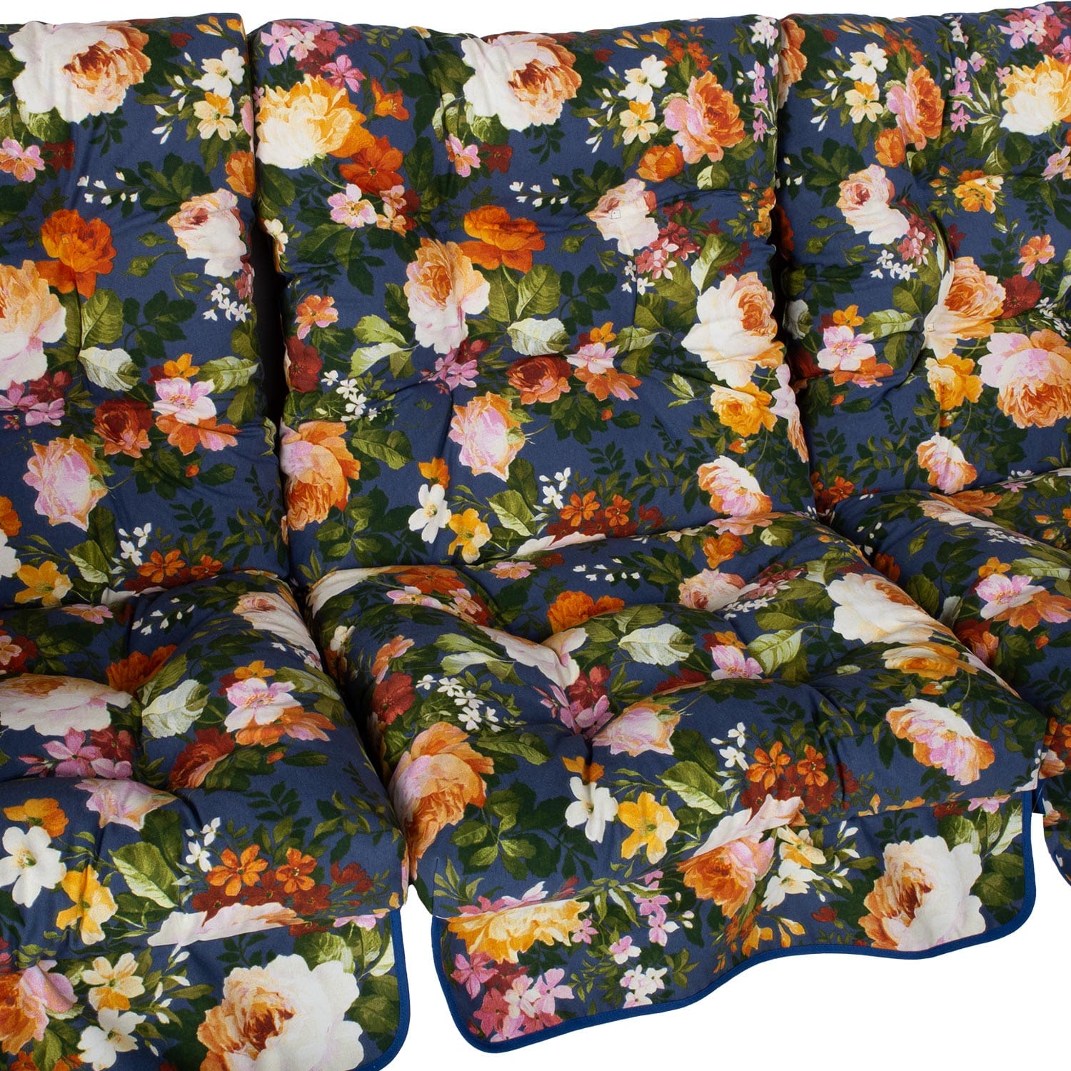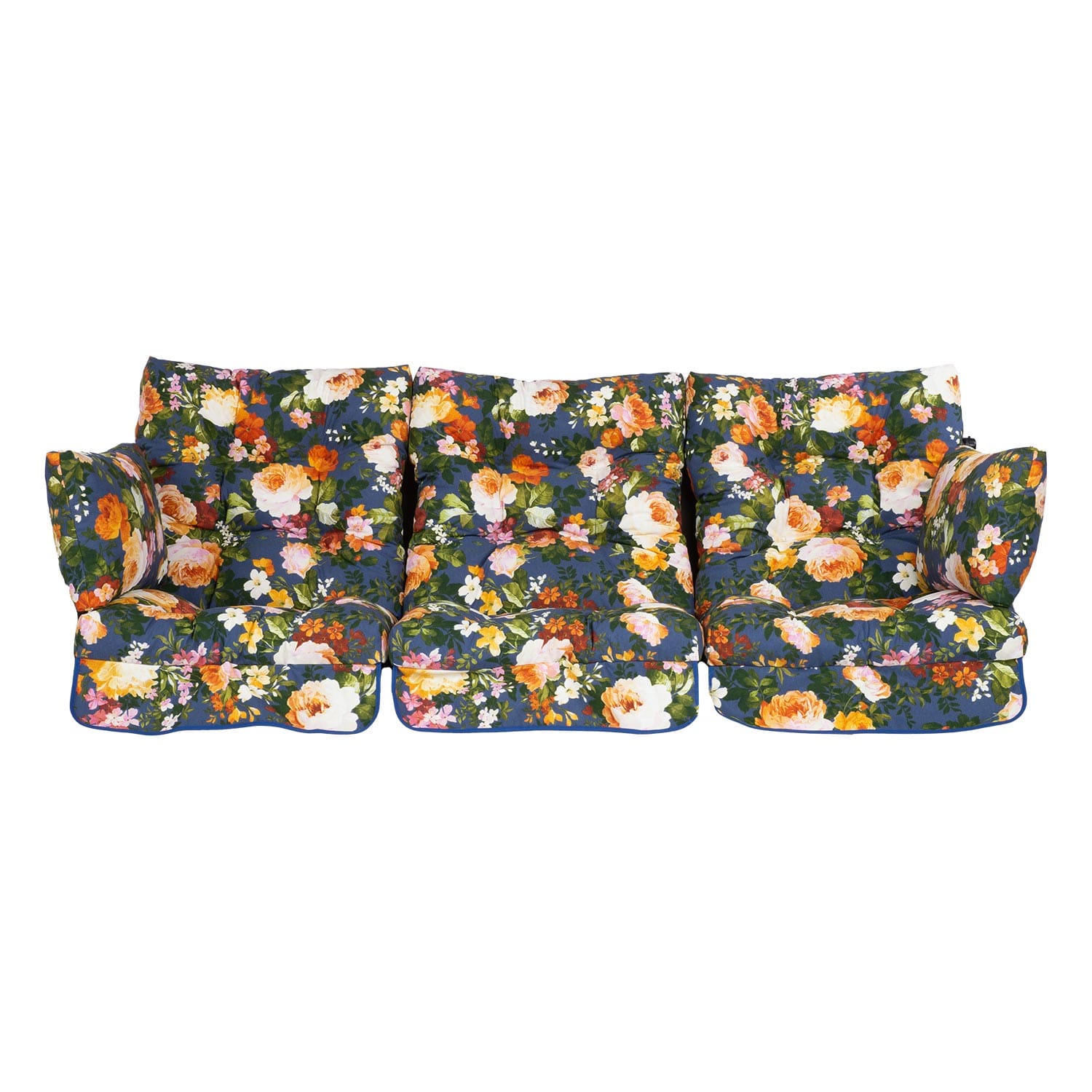 Kiigepadjad ROMA sinised lilled, kangas 428, 100% polüester. Ühe padja mõõdud: laius 56cm, pikkus 108cm, paksus 10cm. Komplektis 3tk.