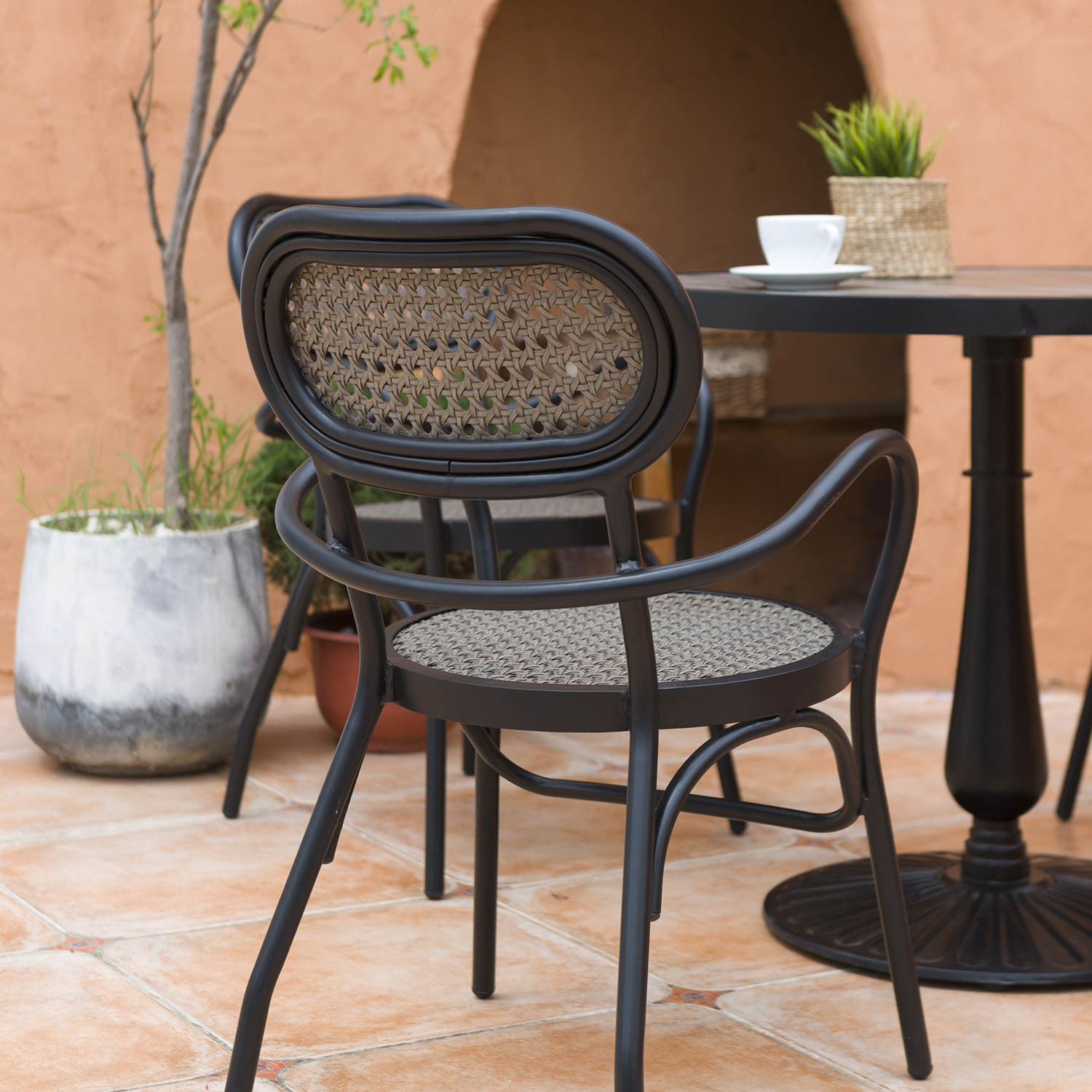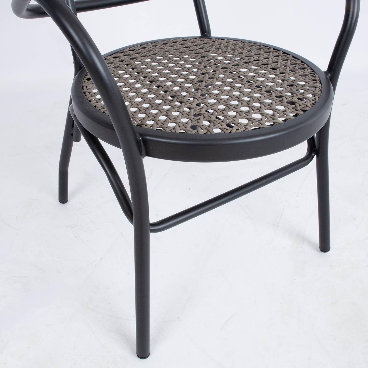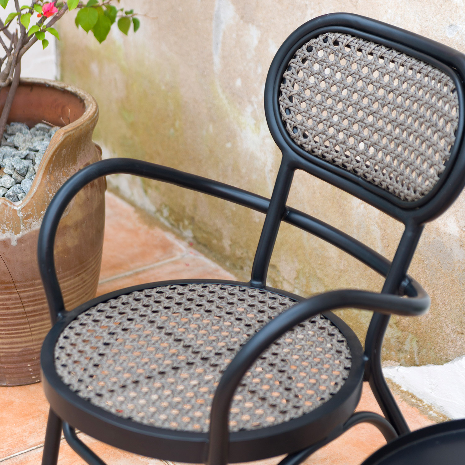 Tool BOLGHERI must. Paigutades aiatoolid rõdule, terrassile või aeda, saab kujundada hubase istumisala, kus päeval kaunist ilma nautida või õdusaid õhtuid veeta. Valides juurde sobiva laua ja kombineerides sarnaseid tooteid, on võimalik luua endale meelepärane ja harmooniline komplekt. Tooli iste ja seljatugi on kaetud halli plastikpunutisega. Tooli raam on valmistatud mustast pulbervärvitud alumiiniumist. Metalltoru mõõdud on D25x1,8mm. Tooli mõõdud on 56x62xH83cm.