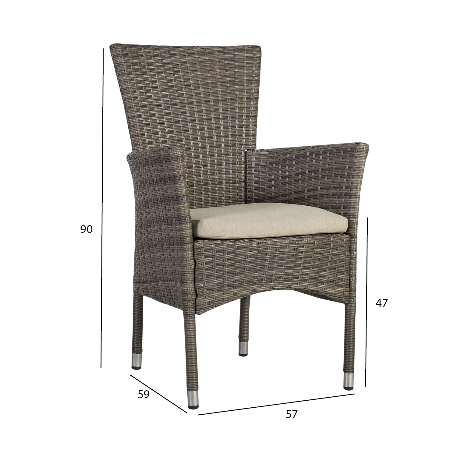 Tool PALOMA 57x59xH90cm, hallikaspruun. Tooli pulbervärvitud terasraam on kaetud plastikpunutisega. Istmepadi kuulub komplekti. Padjakate on valmistatud bee˛ist polüesterkangast. Padja mõõdud 44x46x5cm. Raami ja jalgade terastorude mõõdud on D25x0,8mm. Tooli istme laius 45cm, istme sügavus 46cm, istme kõrgus 47cm (koos padjaga). Seljatoe kõrgus 50cm, käetoe kõrgus maast 63cm. Kaalupiirang 100kg. Toode on muutlikes ilmastikutingimustes hästi vastupidav ja ei nõua erilist hooldust. Kaitset ilmastikuolude eest vajab ainult padi. HOIUSTAMINE: suvehooaja lõppedes soovitame aiamööblit hoiustada siseruumides. Puhastage ja kuivatage mööbel enne hoiule panekut. Kasutage hoiustamiseks kuiva ning hea ventilatsiooniga ruumi.
