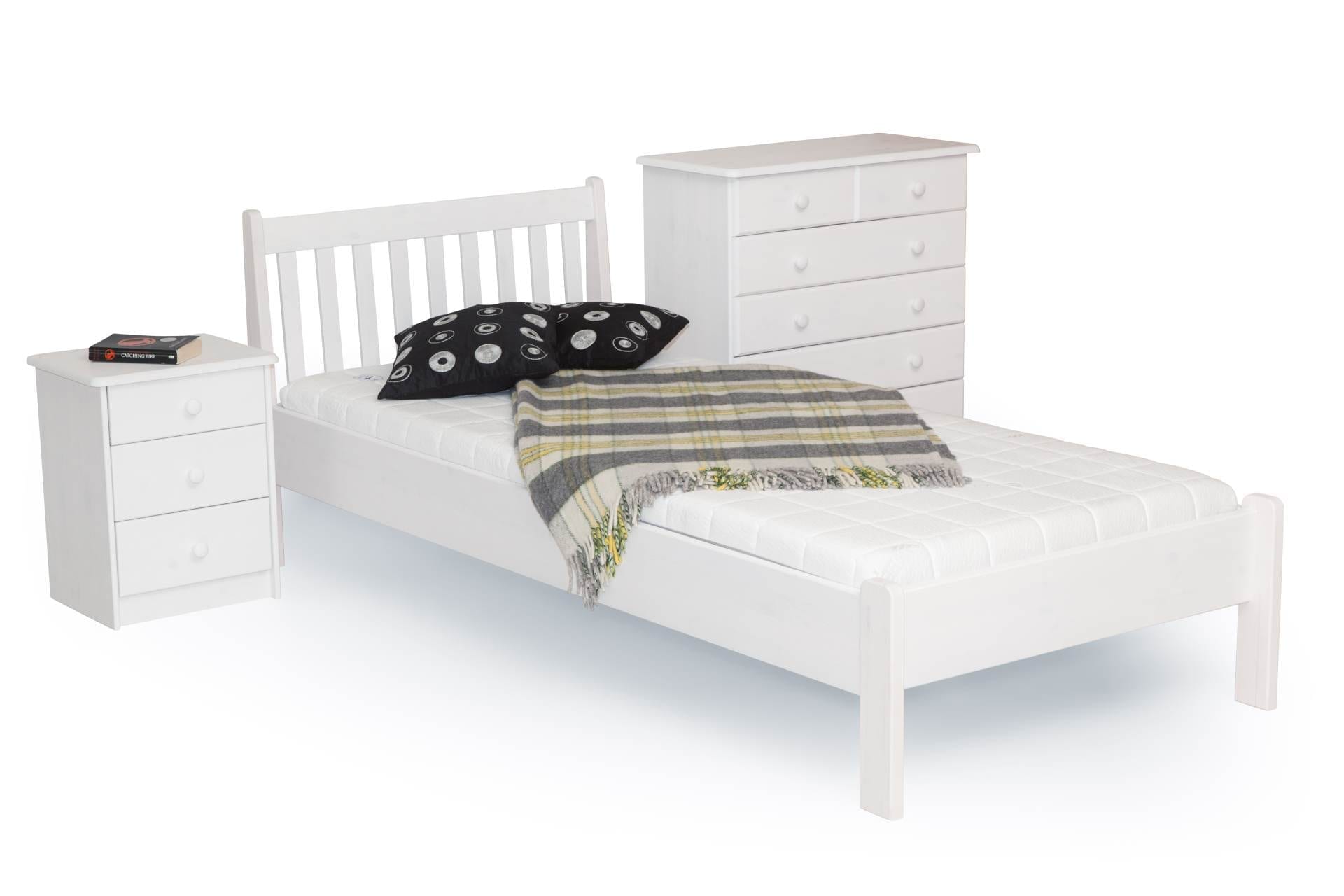 Voodi BELLA 90 A8209. Voodi sarjast Bella. Voodipõhi on puitlippidest. Voodipeats on 13 cm tahapoole kaldu. Öökapp, kummut ja madrats ei kuulu komplekti, voodisse sobib madrats mõõtudega 90 x 200 cm.