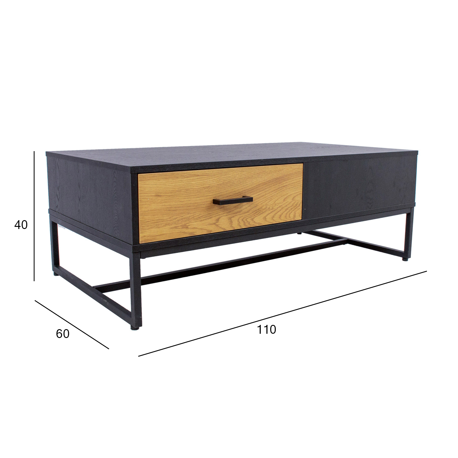 Diivanilaud AMSTERDAM 110x60xH40cm. Materjal: melamiinplaat, värvus: tamm/must. Must metallist alusraam. Vaikselt sulguvad sahtlisiinid. Mustad alumiiniumust käepidemed.