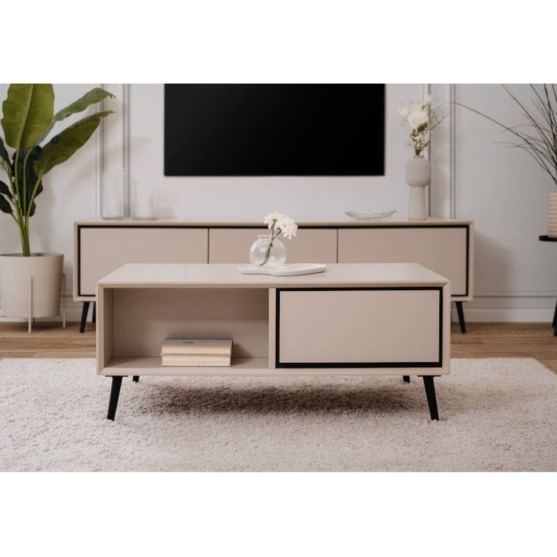 Kogu sarja mööbel on valmistatud 18 mm mööbliplaadist, capuccino viimistluses. Diivanilaual on üks sahtel ning üks avatud osa. Jalad plastikust, kõrgusega 16 cm.