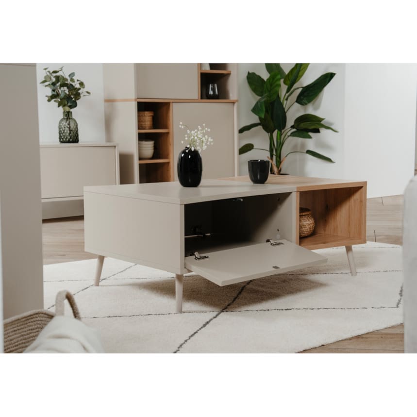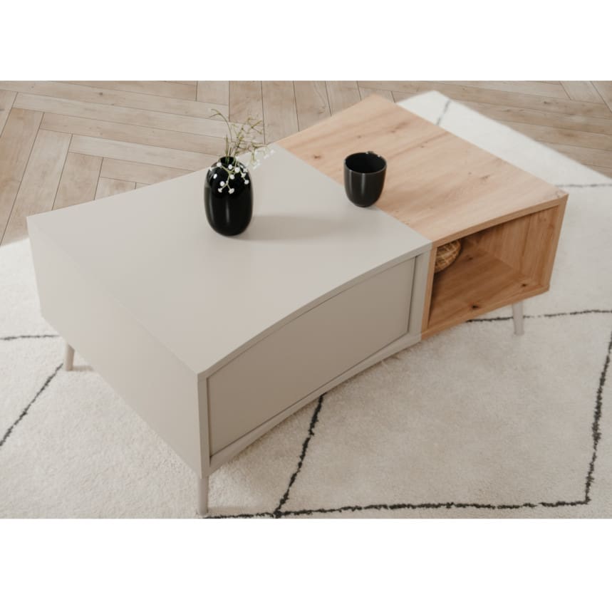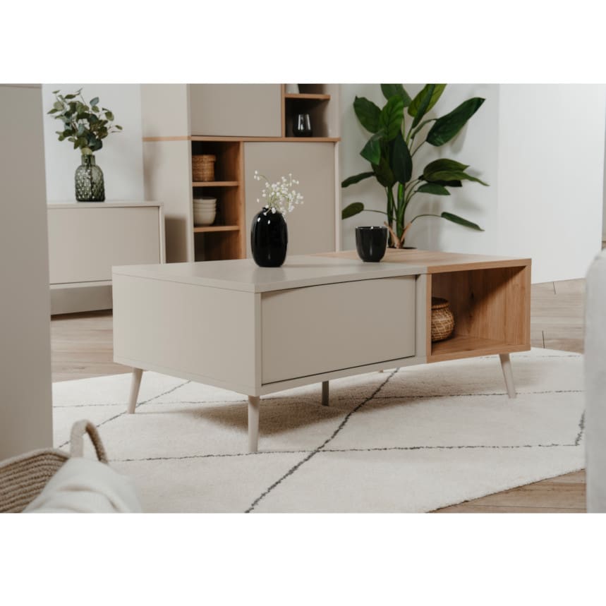 Sinopi mööblisari on valmistatud vastupidavast melamiinkattega mööbliplaadist ning ühendab kaasaegse disaini ja praktilise kasutusmugavuse. Käepidemeteta esiosa ja push-to-open avamissüsteem loovad puhta ning minimalistliku üldmulje, mis sobib hästi erinevatesse interjööridesse. Jalad plastikust, tugijalg metallist. Diivanilaua pealmine plaat on kergelt kaardus. Laual on üks avatud osa ning üks suletud ustega osa.
