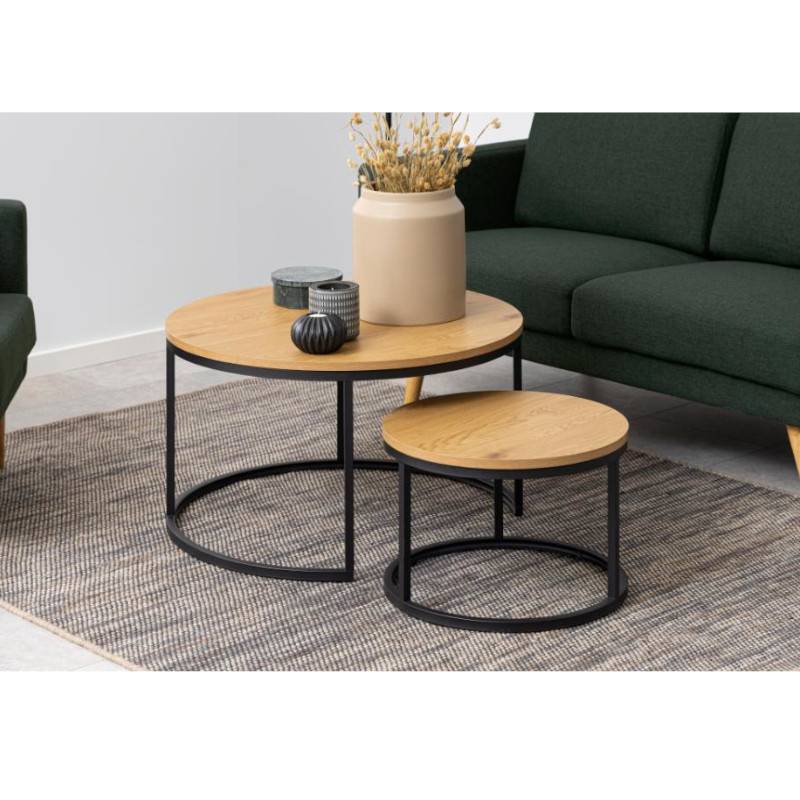 Ümara siluetiga kahest lauast koosnev komplekt on igas kaasaegses kodus praktiline. Kompaktne disain on hea ka väiksematesse ruumidesse, väiksem laud mahub täielikult suurema alla. Must metallraam sulandub täiuslikuks tervikuks koos sooja tammepuiduga.
