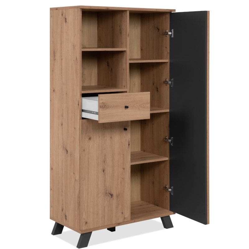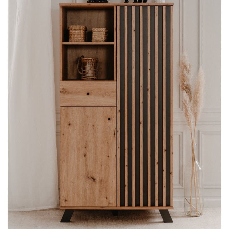 Kogu sarja mööbel on valmistatud MDFi, puitlaastplaadi ja HDFi kooslusest. Kvaliteetsed ABS servad muudavad mööbli eriti löögikindlaks ja põrutuskindlaks. Kapi paremal pool on üks soonelise disainiga uks, mille taga kolm reguleeritava kõrgusega vaheriiulit. Vasakul pool on üks sahtel, ülemises osas avatud osa vaheriiuliga. Alumises osas üks uks, mille taga samuti üks vaheriiul. Jalad on metallist.