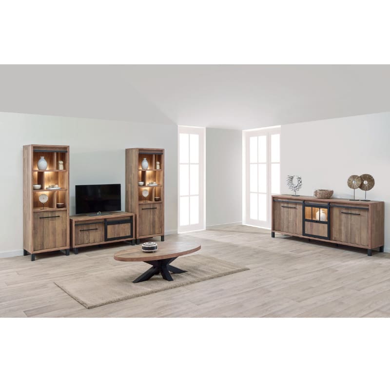 Kogu sarja mööbel on valmistatud vastupidavast mööbliplaadist ning on vana tiikpuu imitatsioonis, detailid mustas toonis. Kapil on üks uks ning viis avatud osa. Ukse taga üks vaheriiul. Ukse hinged asuvad paremal, mistõttu uks avaneb vasakule. Valgustus kuulub komplekti.