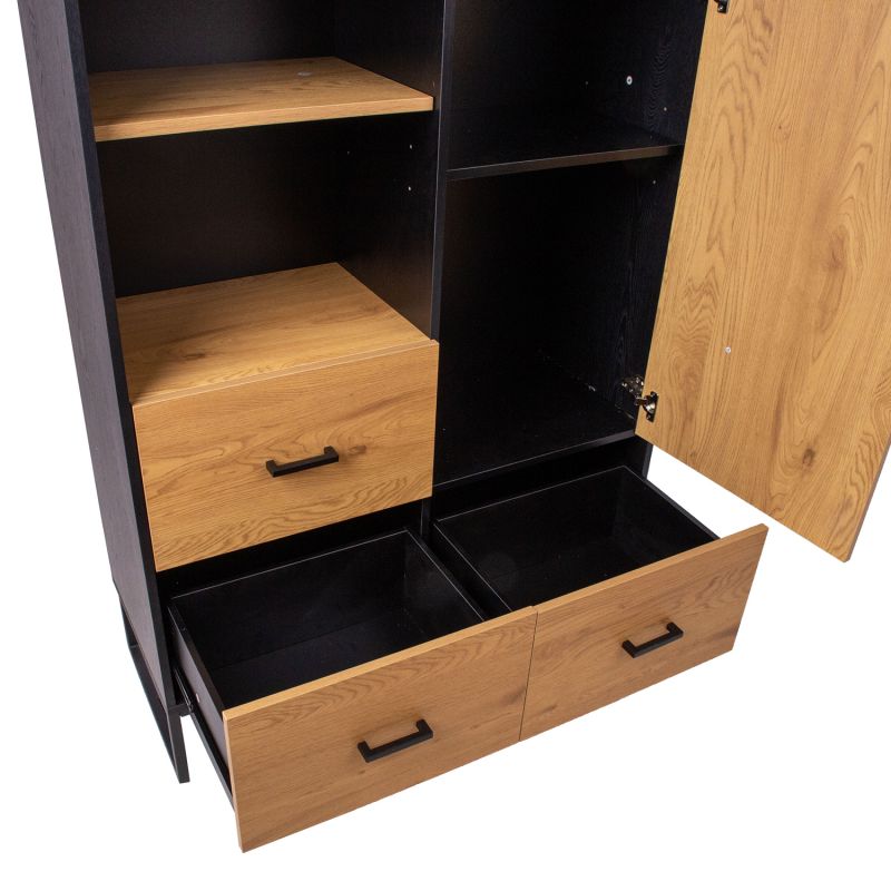 Kummut AMSTERDAM 100x40xH140cm. Materjal: melamiinplaat, värvus: tamm/must. Must metallist alusraam. Vaikselt sulguvad hinged ja sahtlisiinid. Mustad alumiiniumust käepidemed.