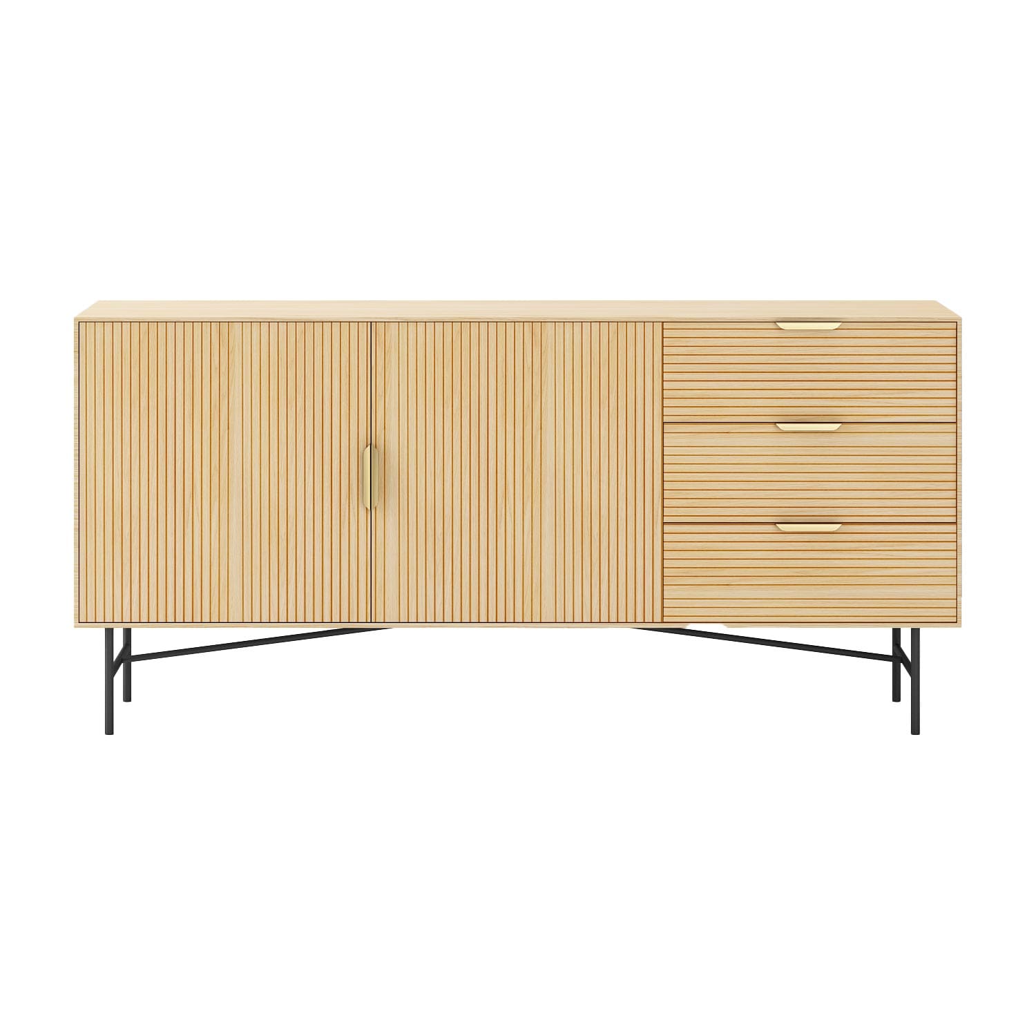 Kummut on valmistatud heleda puidudekooriga melamiinplaadist. Ribilised esipaneelid ja kuldsed käepidemed annavad kummutile trendika välimuse.