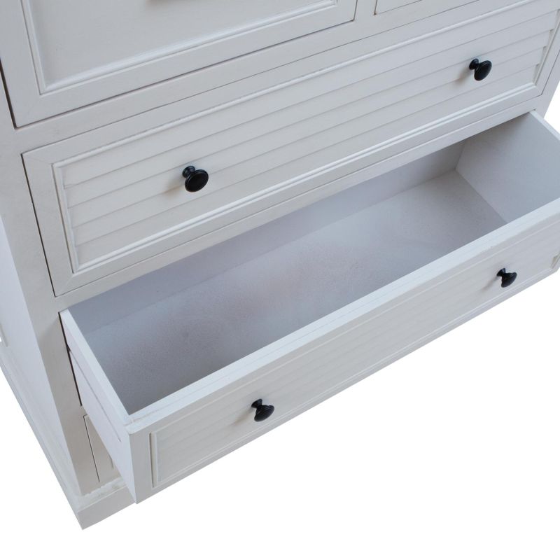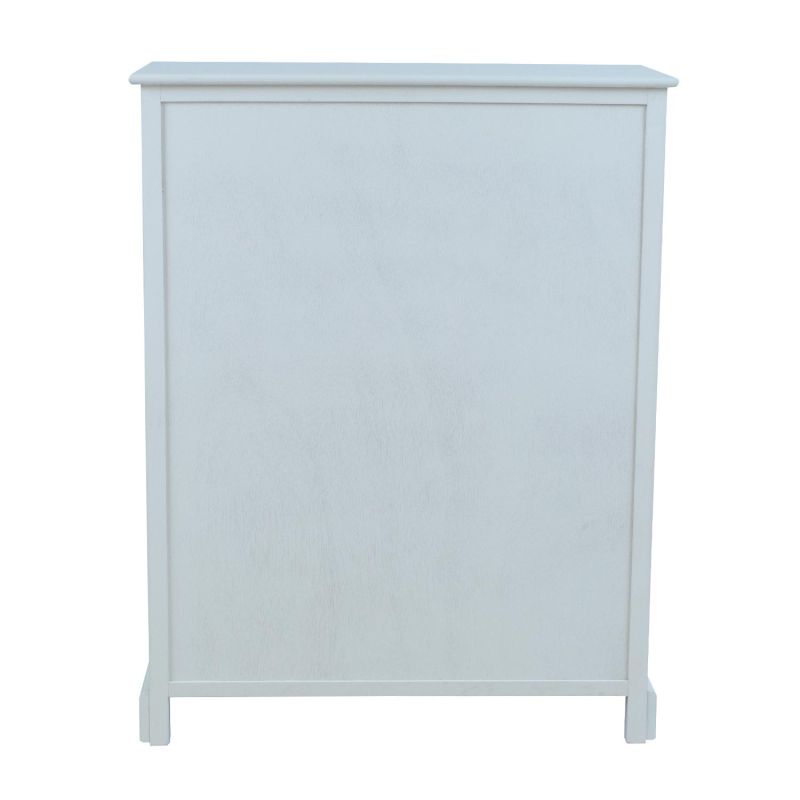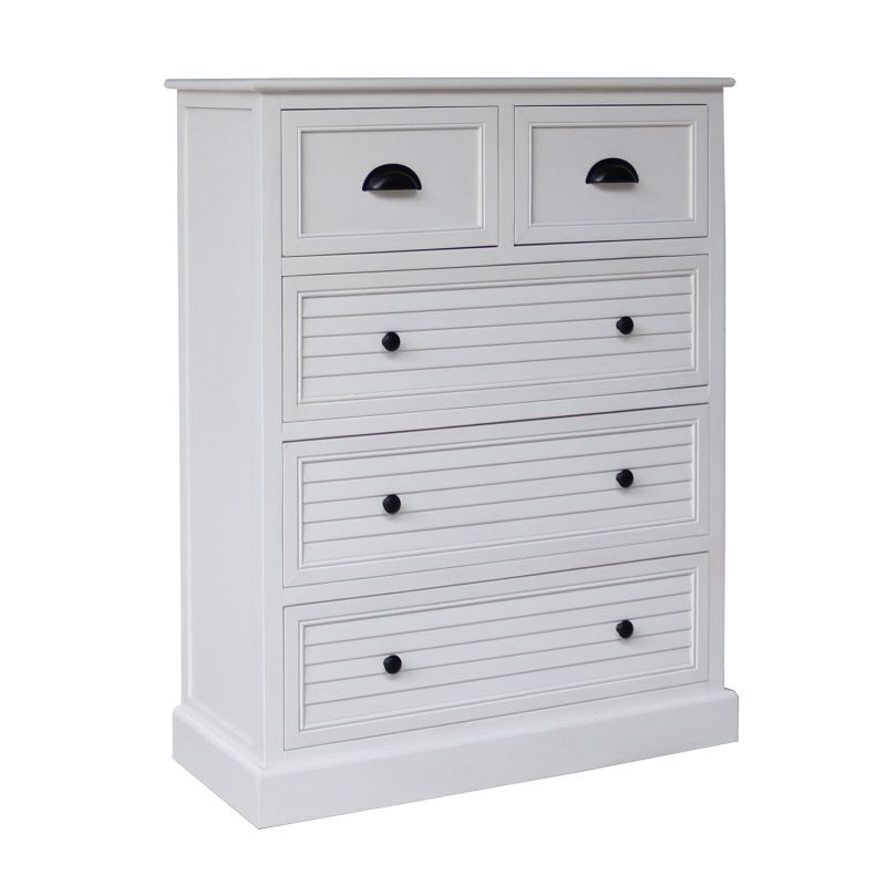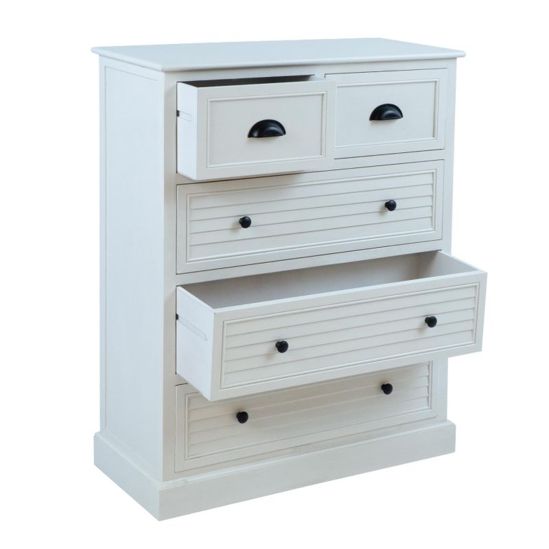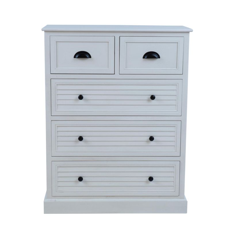 Kummuti põhikonstruktsioon ja sokkel on valmistatud männipuidust. Pealmine lauaplaat, sahtlid ja paneelid on värvitud MDF. Kummut on viimistletud valge värviga. Metallist käepidemetega sahtlid on ilma siinideta.