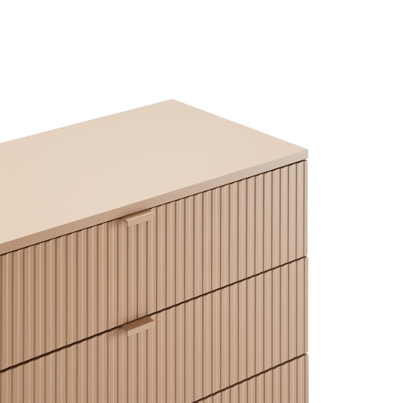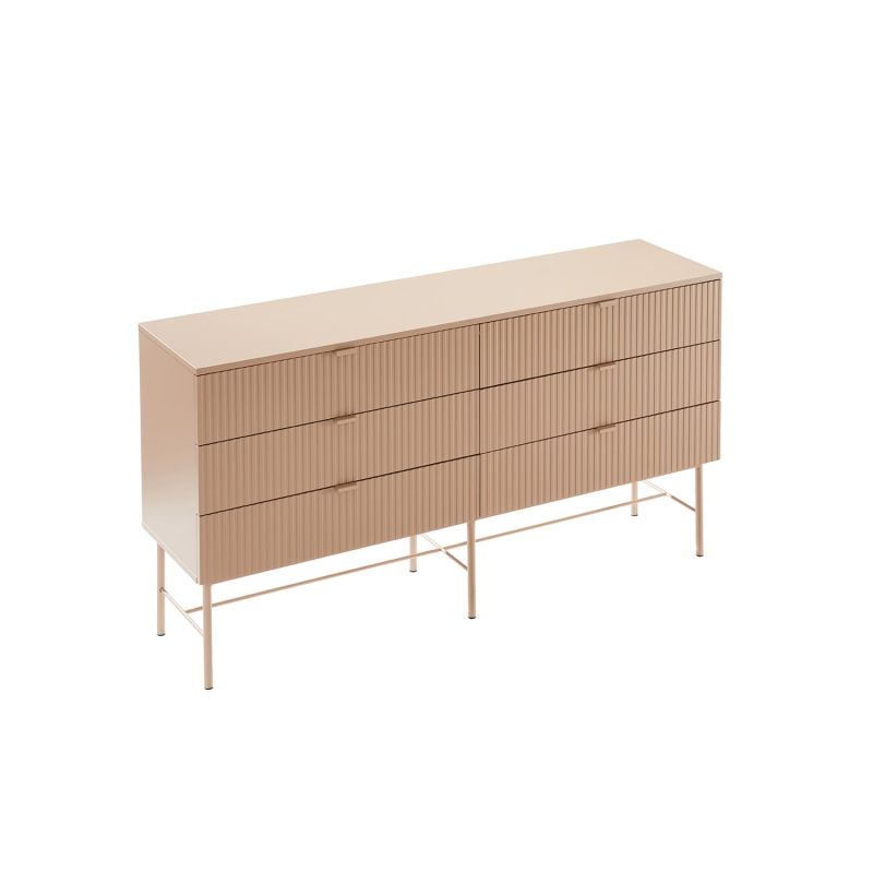 Kummut SEQUENCE 6-sahtliga 158x40xH83cm, cappuccino. Kummuti korpus on valmistatud MDF plaadist. Reljeefse pinnaga triibulised sahtlite esipaneelid annavad tootele omanäolise ja trendika välimuse. Sahtlid liiguvad metallsiinidel. Kummut on viimistletud vastupidava polüuretaanvärviga. Metallist alusraam ja jalad on viimistletud pulbervärviga.