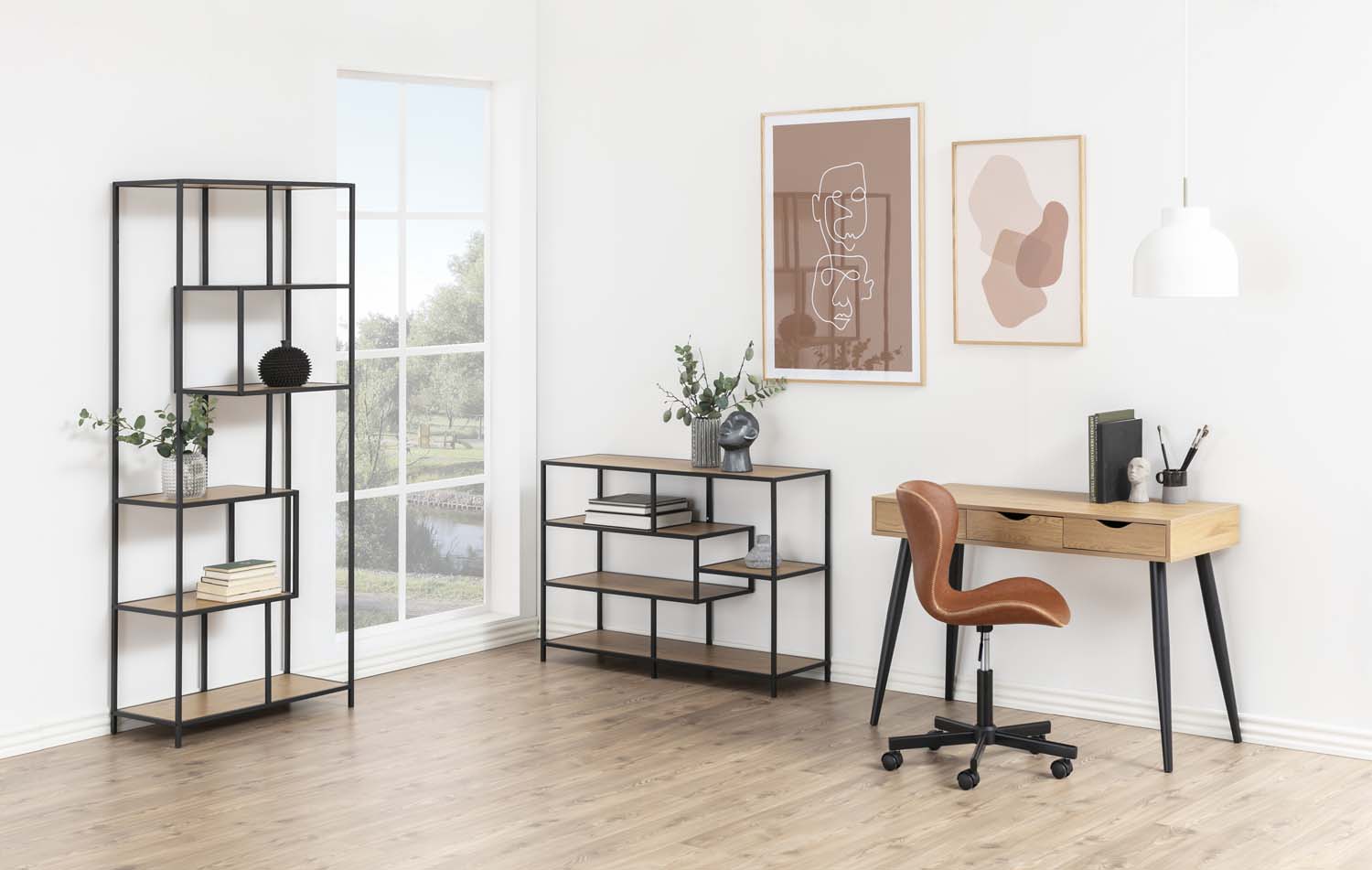 Raamaturiiul on ideaalne aktsent, mis muudab ruumi stiilsemaks. Sellel on isikupära, mis sobib paljude sisekujundusstiilidega. Maitsekat ja praktilist riiulit saab kasutada erinevates ruumides asjade mugavaks hoiustamiseks. Riiul on valmistatud hoolikalt valitud materjalidest ja seda on lihtne hooldada. Puiduimitatsiooniga riiulid on valmistatud MDF-ist. Raam on valmistatud musta värvi metallist. Toote mõõdud on 114x35xH78cm.
