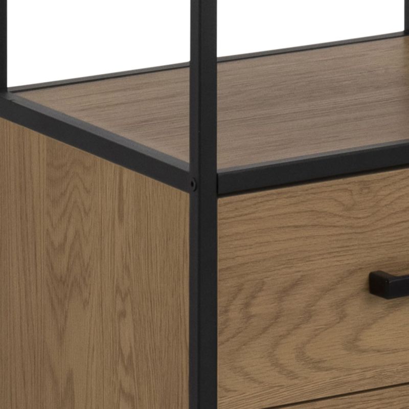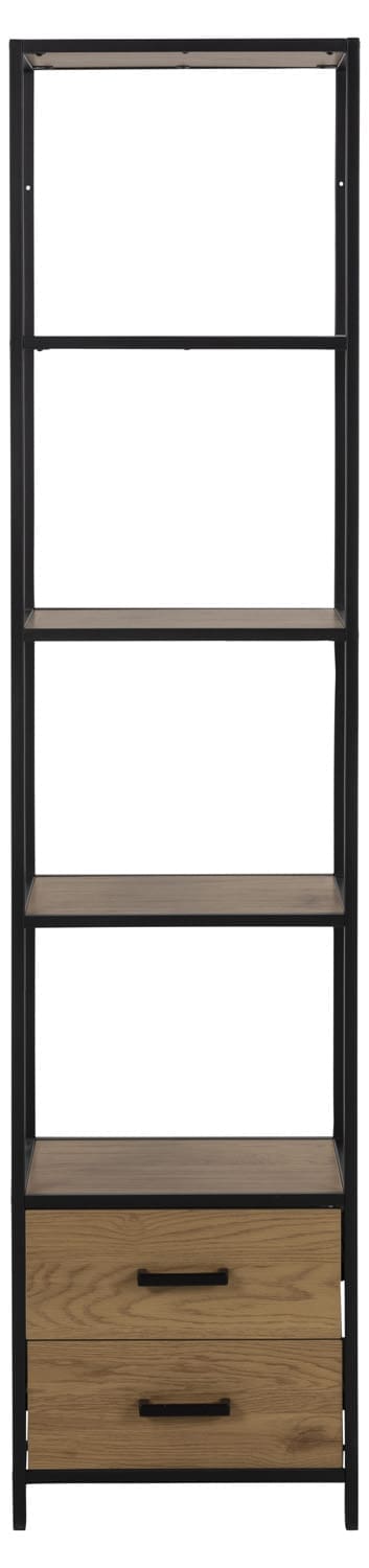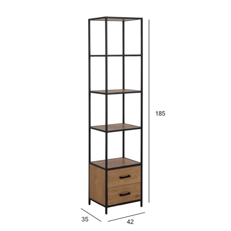Raamaturiiul pakub nii hoiuruumi kui toob ruumi ka moodsat industriaalset hõngu. Sellel on 3 riiulit ja 2 sahtlit. Riiul on ideaalne aktsent igasse ruumi, lisades sellele stiilsust. Riiulil on isikupära, mis sobib paljude interjööridega. Raamaturiiulil on silmatorkav metsiku tamme välimus ja must metallalus pulbervärvitud viimistlusega. Materjale on lihtne hooldada. Mõõdud on 42x35xH185cm.