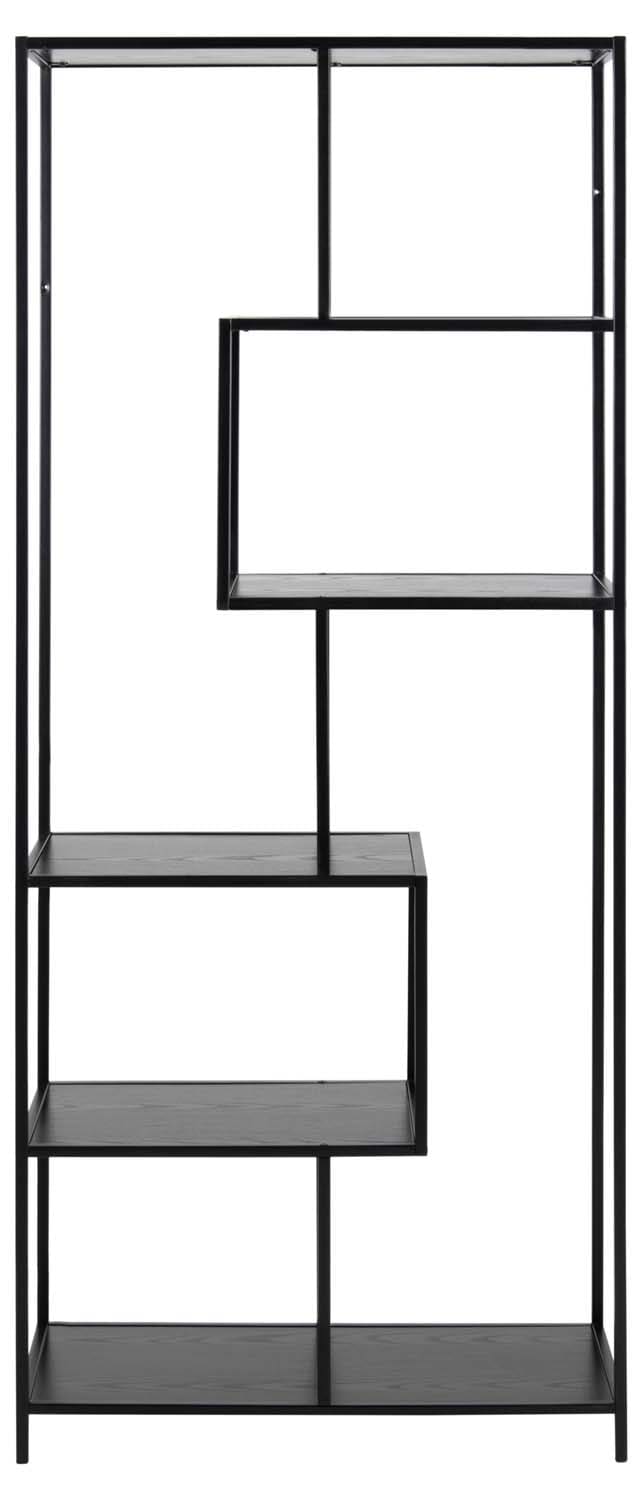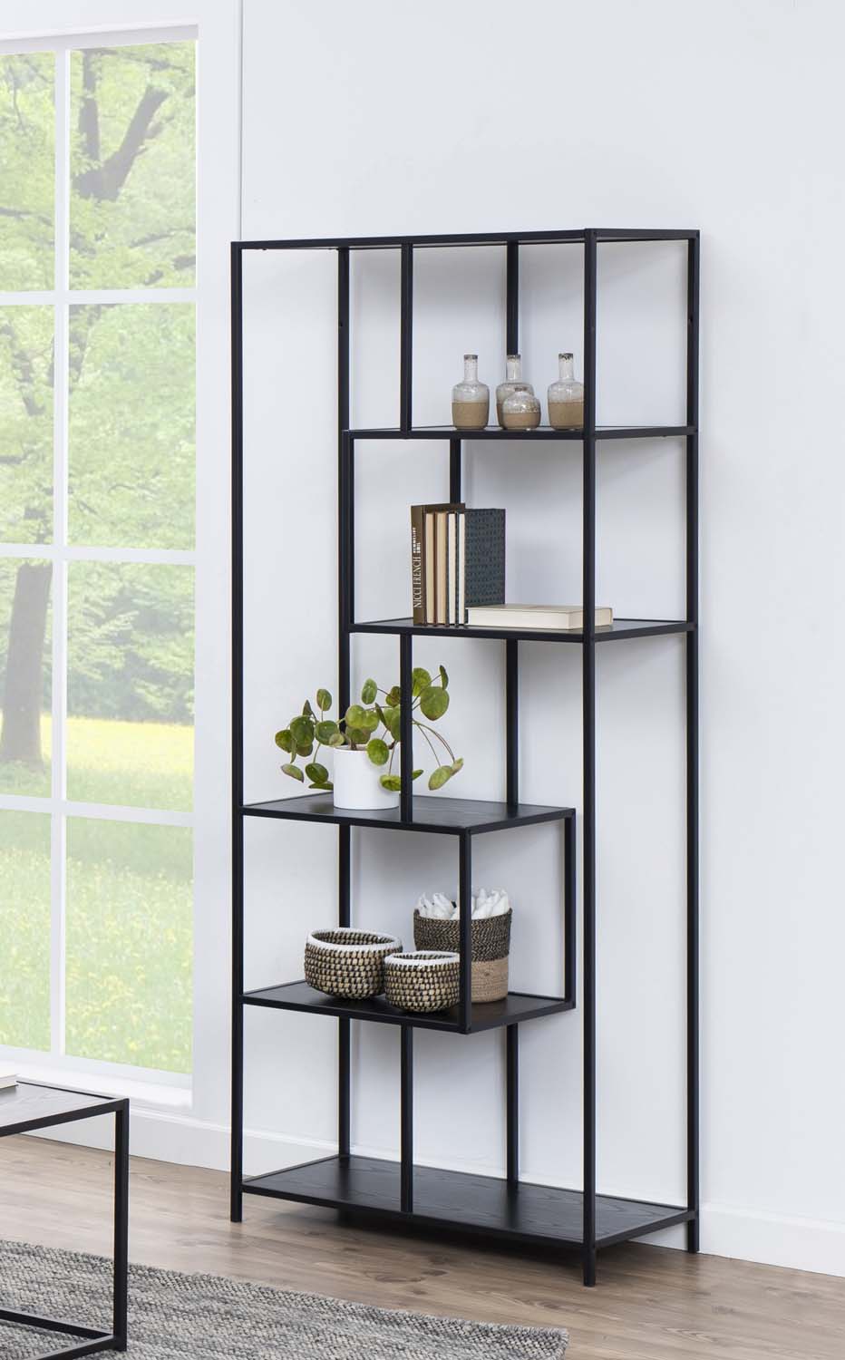 Riiul SEAFORD 77x35xH185cm. Raamaturiiul on ideaalne aktsent igasse ruumi stiili lisamiseks. Riiulil on isikupära, mis sobib paljude interjööridega. Puidu välimus on kombineeritud pulbervärvitud metallalusega. Hoolikalt valitud materjale on lihtne hooldada. Riiulid: must saare melamiin, raam: metall, must. HOOLDUS: Üldjuhul vajavad melamiinpinnad vähe hoolt. Kasutage seebiveest kuivaks väänatud lappi ja pühkige pind kuivaks. Vältige küürimispulbri või nailonkäsnade kasutamist, kuna need pleegitavad või kriimustavad laminaati. Ärge hõõruge pinda kõvade esemetega.