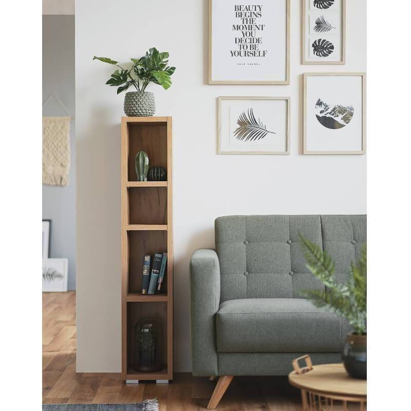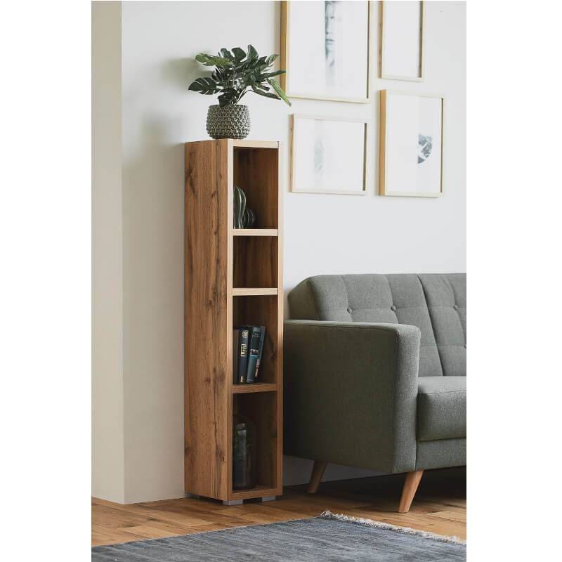 Nelja riiuliga raamaturiiul on valmistatud mööbliplaadist, jalad plastikust
