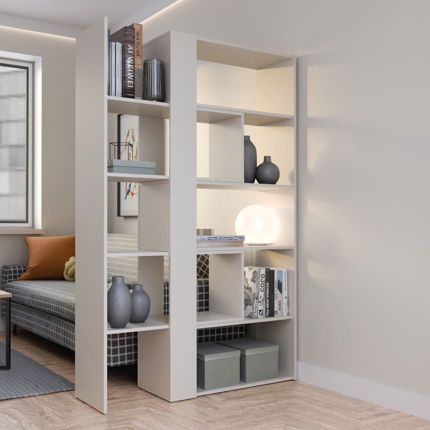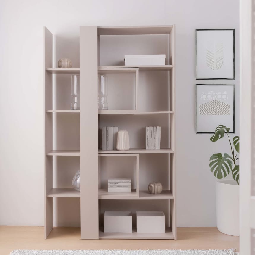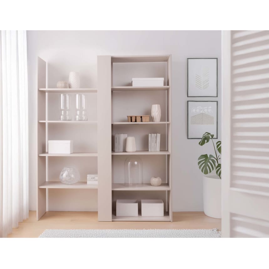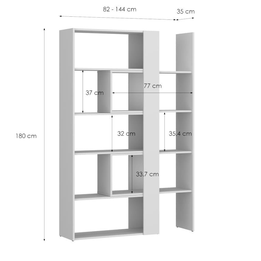Tänu reguleeritavale laiusele (82-144 cm) sobitub see riiul erineva suuruse ja kujundusega ruumidesse. Riiuli laiuse muutmine muudab ka riiulite vahekaugust, mis võimaldab sul kohandada mööbli välimust ja funktsionaalsust. Valmistatud kvaliteetsest mööbliplaadist, tagades vastupidavuse ja stiilse välimuse.