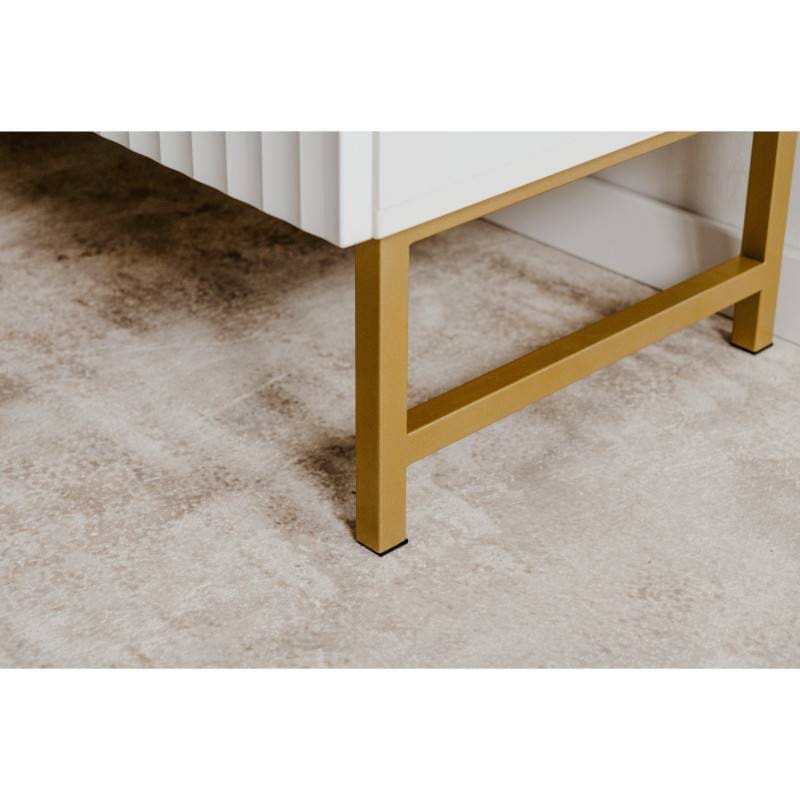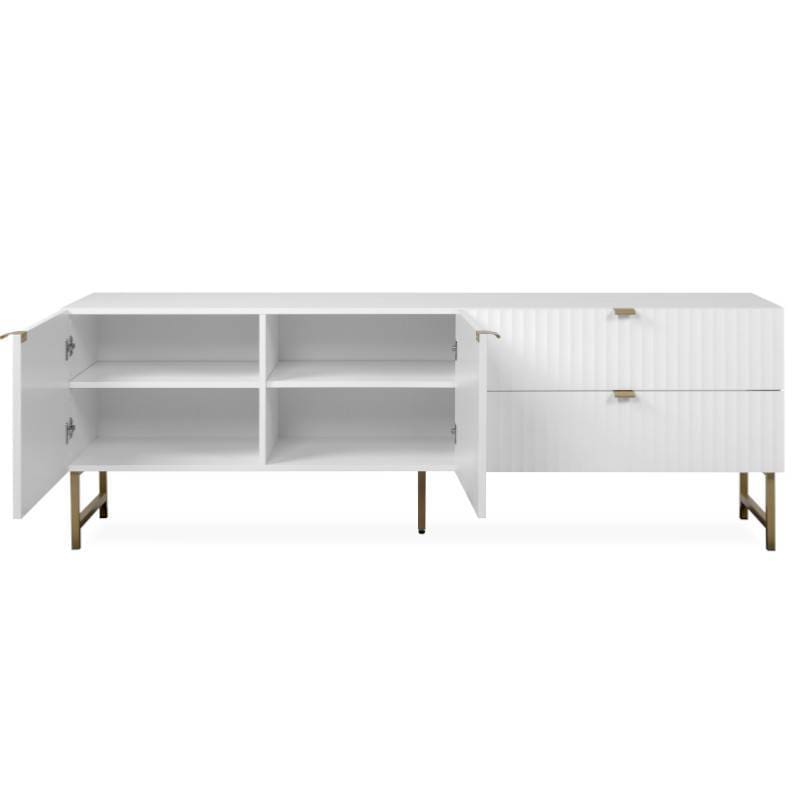 Mööbli ajas kestvuse tagavad hoolikalt valitud materjalid. Tv-aluse valmistamisel on kasutatud MDFi, puitlaastplaati. Jalad on valmistatud metallist ning need on kuldses toonis. Jala kõrgus on 19.5 cm. Kaks sahtlit liiguvad metallsiinidel. Käepidemed on valmistatud kuldseks värvitud plastikust. Mõlema ukse taga on üks reguleeritava kõrgusega vaheriiul. Üks riiul mõõdus 47.5 x 36 x 15 cm ja teine riiul 48.5 x 36 x 15 cm.
