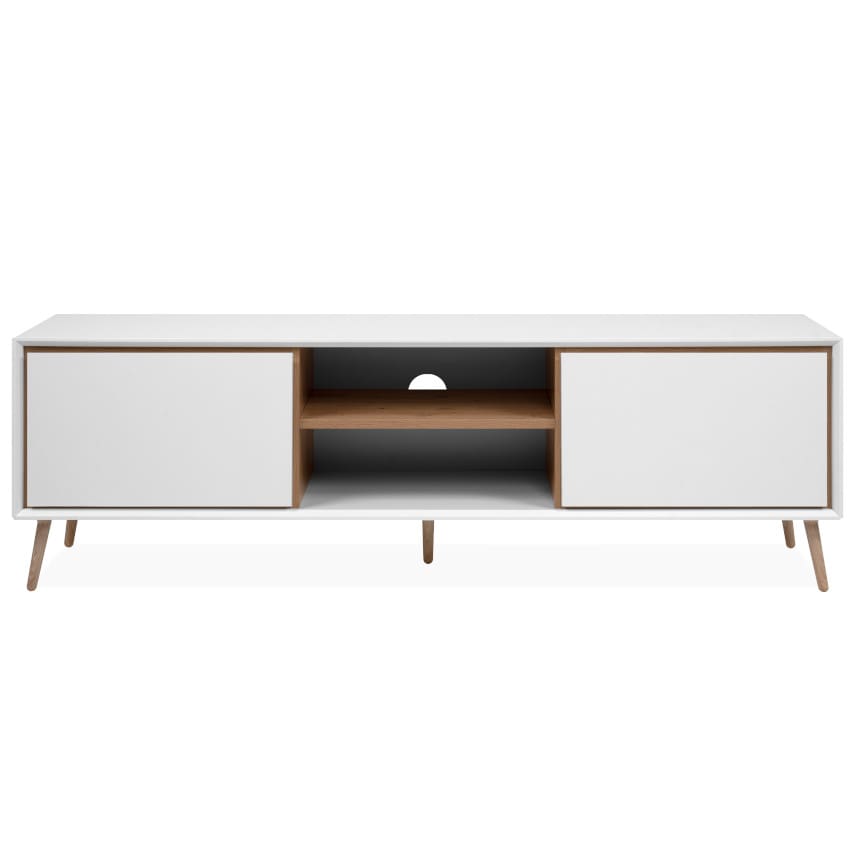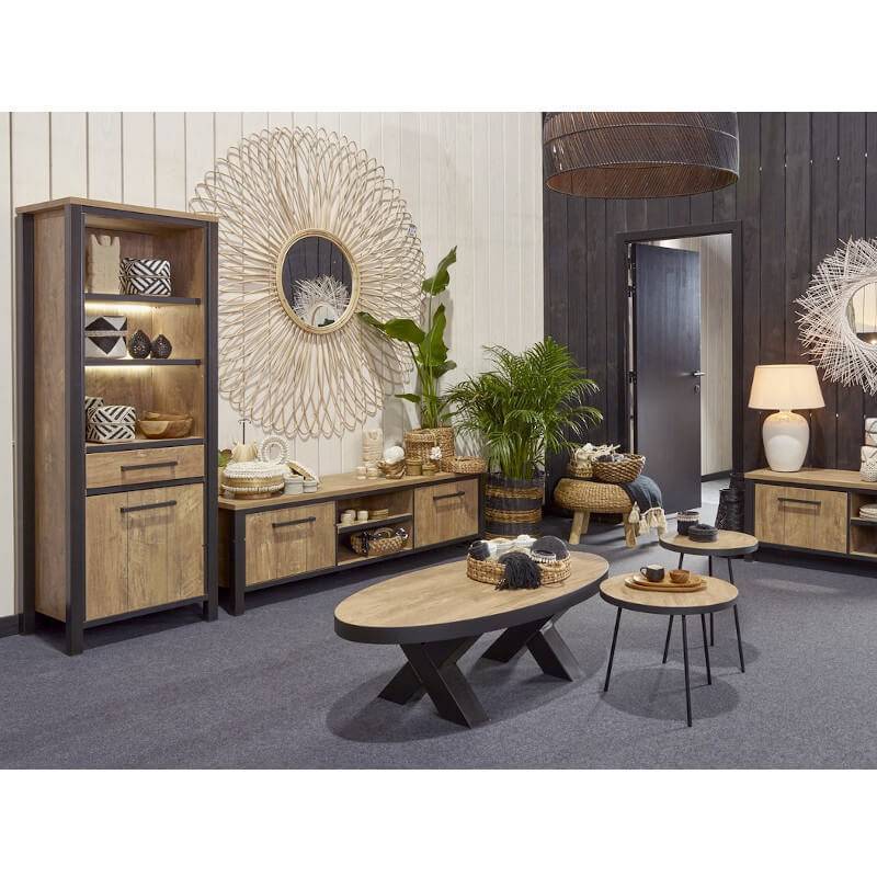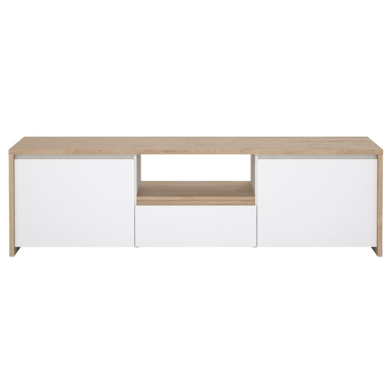 Tv-alus Lovina raam nig käepidemed on valmistatud matt mustast metallist. Tv-aluse uksed ning riiulid on valmistatud melamiinkattega mööbliplaadist ning on viimistletud puidu imitatsiooniga. Keskel on üks vaheriiul, mis ei ole reguleeritav. Sahtlil on soft-close süsteem. Tv-aluse keskel on üks tugijalg.
