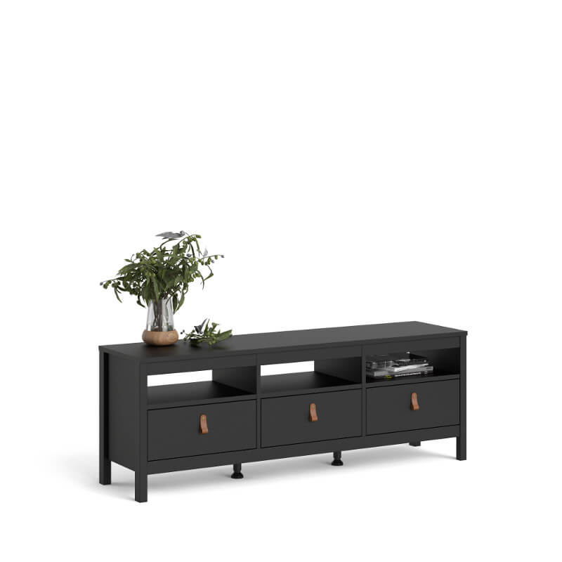 TV-alus on valmistatud mööbliplaadist TV-alus on viimistletud matt musta tooniga. TV-alusel on kaasas sahtli jaoks kaks erinevat käepidet – pruunist nahast või hõbedasest metallist nupp. Sahtlid liiguvad metallsiinidel. TV-alusel on keskel lisatoestusena topeljalad. TV-aluse pealmise lauaplaadi maksimaalne kandevõime on 50 kg. Sahtli kandevõime 5kg ja lahtise vaheriiuli kandevõime 18kg.