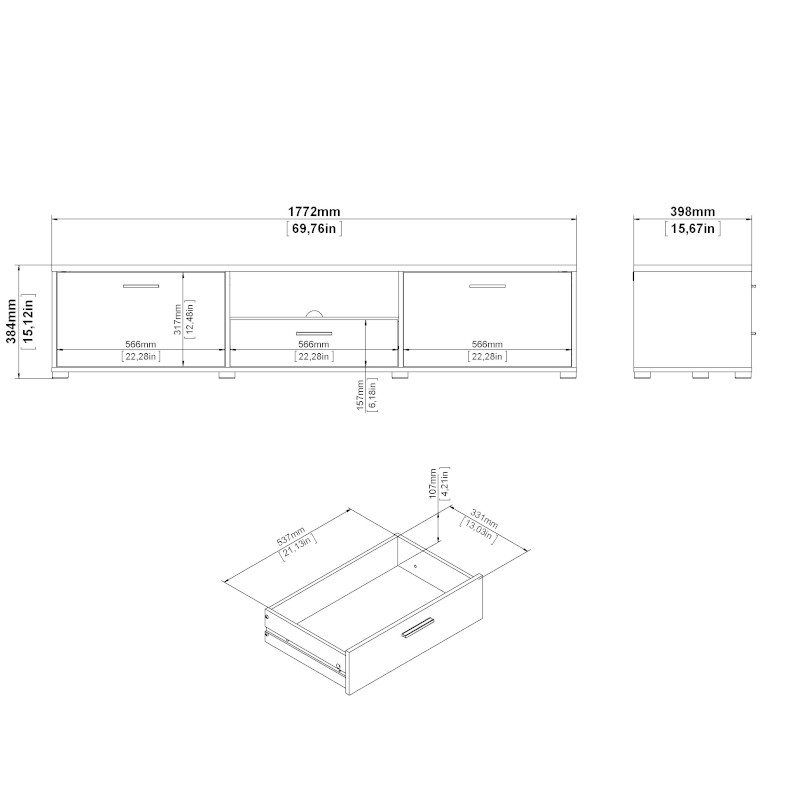 Kogu sarja mööbel on valmistatud mööbliplaadist. Tv-alusel on kaks ust, mille taga mugav hoiuruum. Keskel avatud osa ning selle all üks metallsiinidel liikuv sahtel. Jalad ja käepidemed on hallist plastikust.