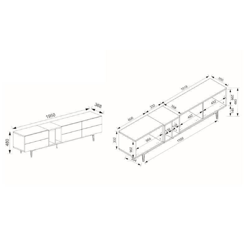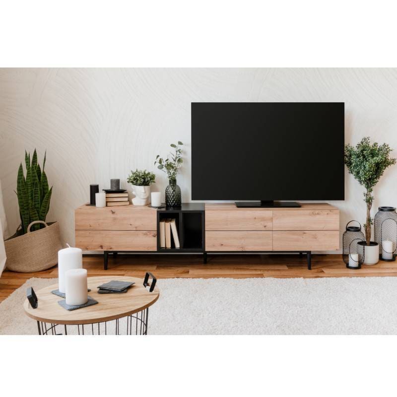 Tv-alus on valmistatud melamiinkattega puitlaastplaadist ning viimistletud musta ning artisan tamme imitatsiooniga. Kapil on kolm ust, iga ukse taga üks vaheriiul, riiulid pole reguleeritava kõrgusega. Mustas toonis on avatud riiuli osa, samuti ühe vaheriiuliga, saate valida kas asetate riiuli vertikaalselt või horisontaalselt. Jalad on plastikust, 14.8 cm kõrged. Uksed on kaldservaga, käepidemeid eraldi ei ole.