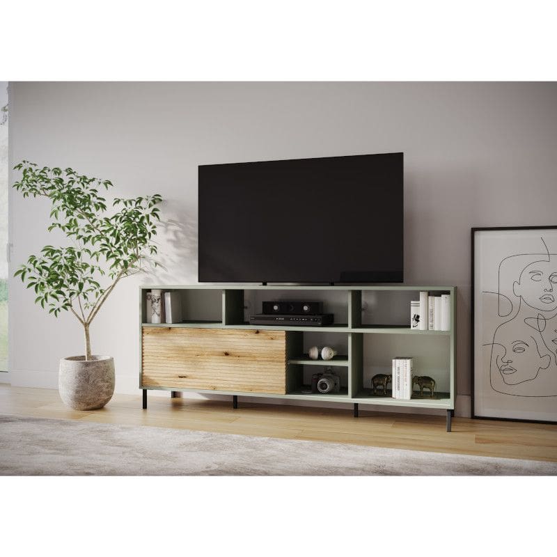 Tv-alus on valmistatud salveirohelises toonis lamineeritud puitlaastplaadist. MDF-ist puitu imiteeriv esiosa on valmistatud soonetehnikas. Elutoa kujundusse suurepäraselt sobituva mööblieseme juurde kuuluvad mahukad riiulid, mida on võimalik osaliselt lükanduksega katta.