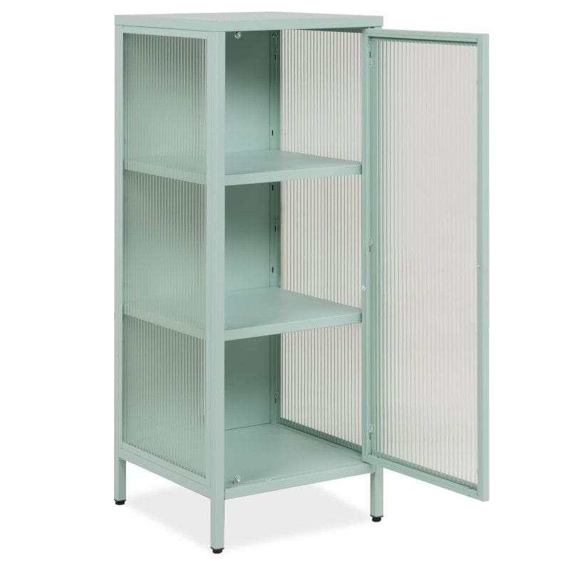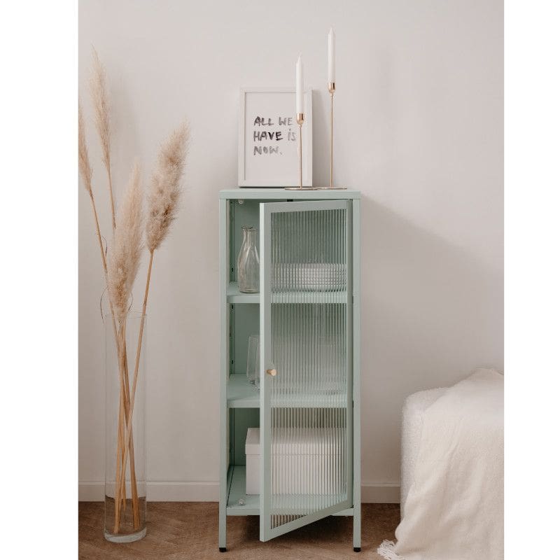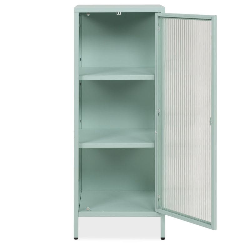 Vitriinkapp on metallist, uksed 5mm klaasist. Kahe ukse taga on kaks vaheriiulit, riiulite vahe 27.8 cm. Jala kõrgus on 10 cm.