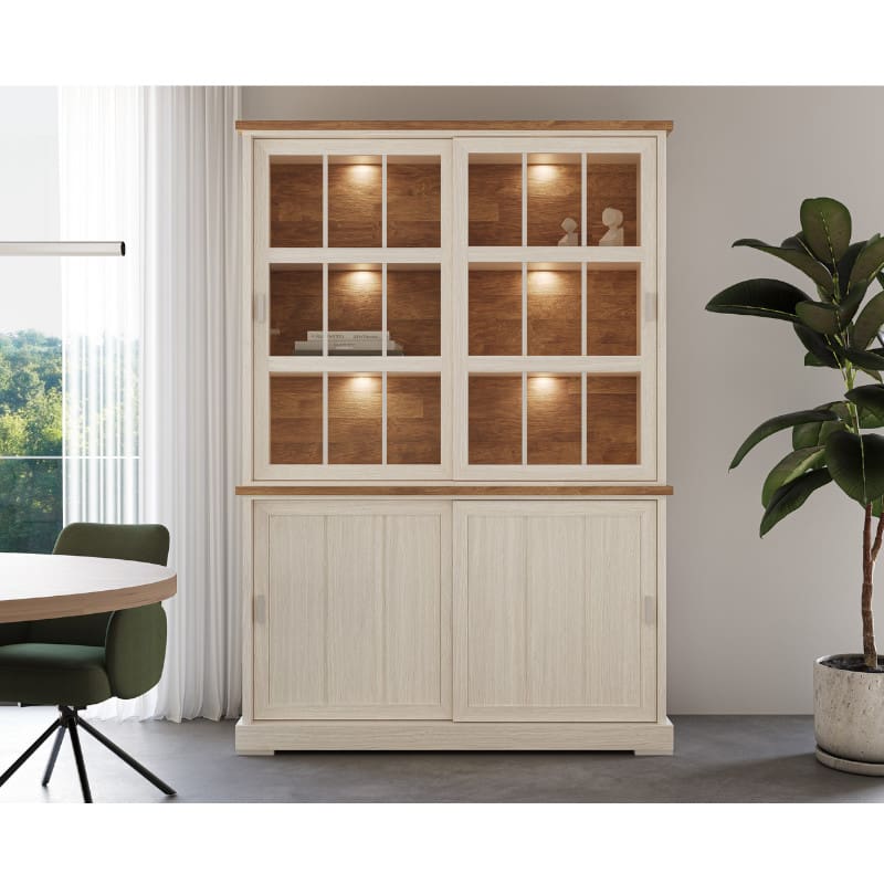 Kogu sarja mööbel on valmistatud kvaliteetsest mööbliplaadist, uksed MDFist, mis tagavad vastupidavuse ning ajatult kauni välimuse. Heledam osa on lehise imitatsioon ning tumedam vana tiikpuu. Riiuli valgustid kuuluvad komplekti. Vitriinkapil on kaks klaaspaneelidega lükandust, mille taga kaks vaheriiulit. Vitriinkapp sobib paigutamiseks sama sarja kummutile ja puhvetkummutile (kood 628747 ja 628751)