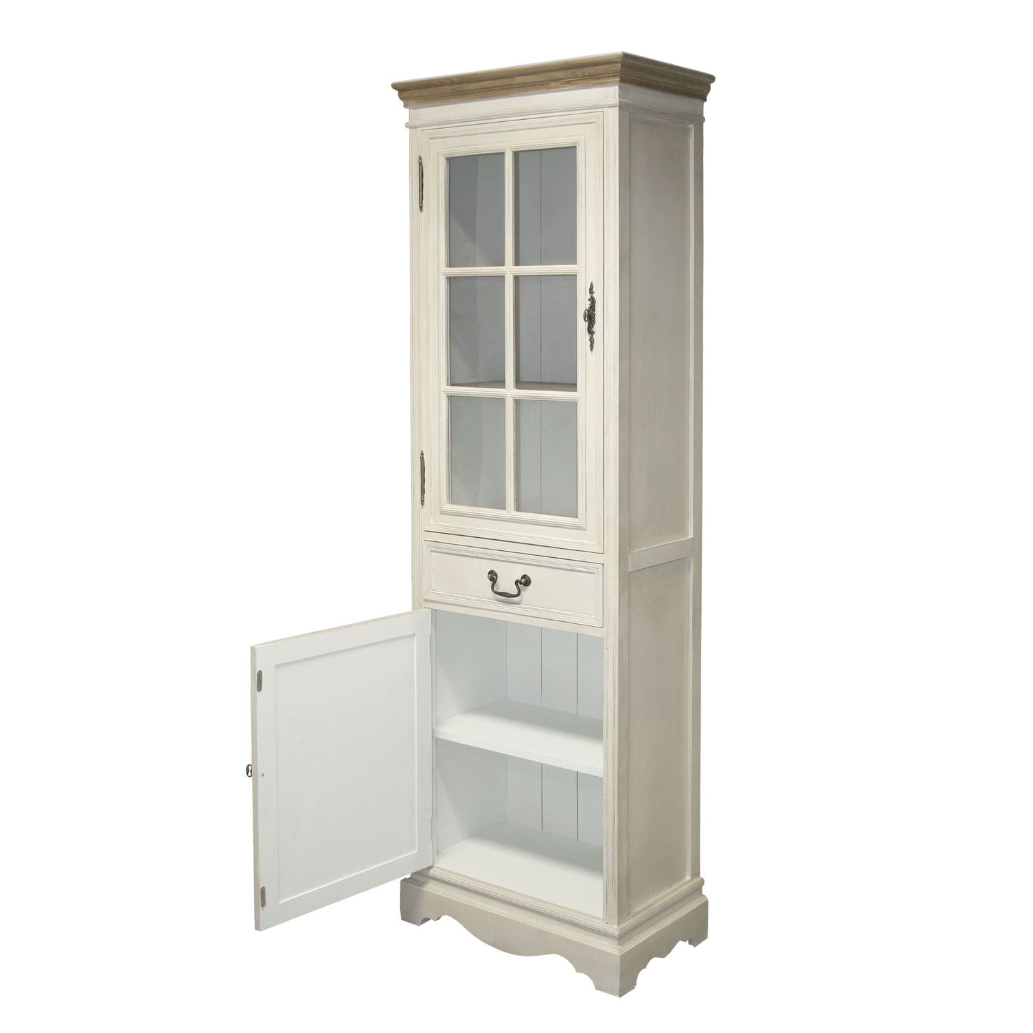 Vitriinkapp SAMIRA 60x35xH195,5cm, antiikvalge/naturaalne. Vitriinkapi põhikonstruktsioon, uksed ja sokkel on valmistatud saarepuidust, MDF küljepaneelid. Kapp on viimistletud antiikvalge värviga. Ülemine profiilliist on valmistatud naturaalses toonis paulownia puidust. Ülemise klaasukse taga on kaks vaheriiulit. Alumises kapis on üks vaheriiul. Kapil on üks ilma siinideta sahtel. Sahtlitel ja ustel on metallist käepidemed.