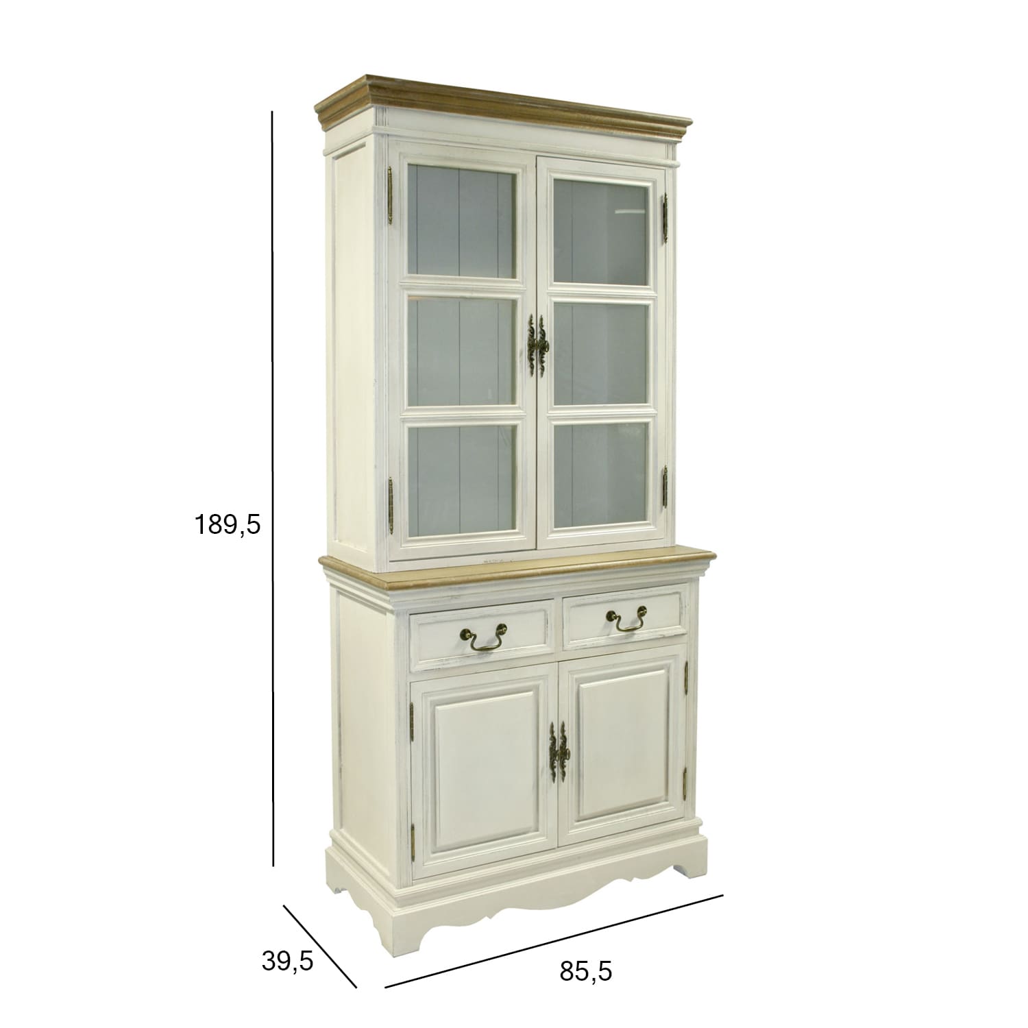 Vitriinkapp SAMIRA 85,5×39,5/31xH189,5cm, antiikvalge/naturaalne. Vitriinkapi põhikonstruktsioon, uksed ja sokkel on valmistatud saarepuidust, MDF küljepaneelid. Kapp on viimistletud antiikvalge värviga. Alumise kapi pealmine MDF plaat on kaetud naturaalse paulownia spooniga. Ülemine profiilliist on valmistatud naturaalses toonis paulownia puidust. Ülemiste klaasuste taga on kaks vaheriiulit. Alumises kapis on üks vaheriiul. Kapil on kaks ilma siinideta sahtlit. Sahtlitel ja ustel on metallist käepidemed.