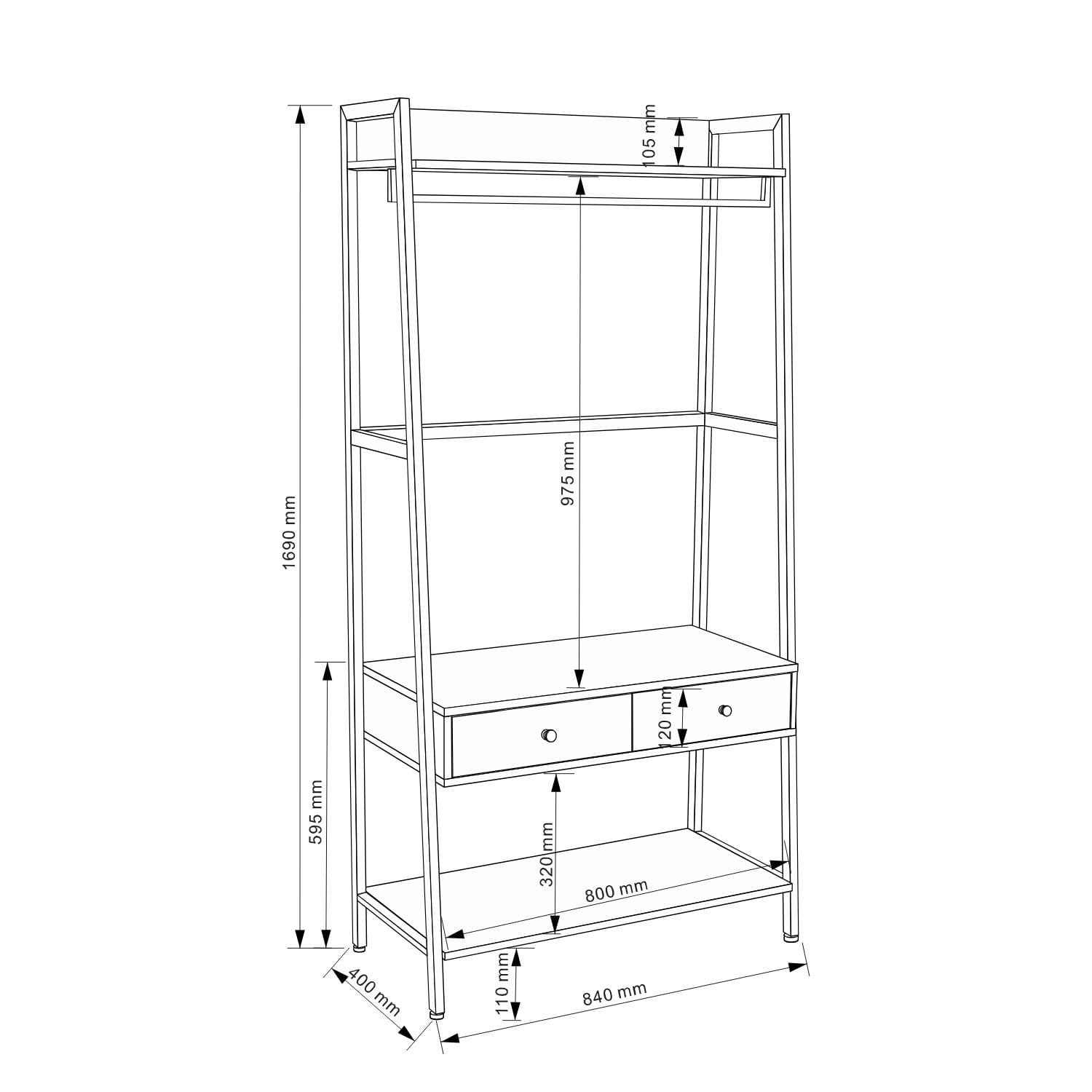 Esikuriiul LAVINIA 2-sahtli ja stangega 84x40xH169cm, saar/must. Riiuli raam on valmistatud metallist ja viimistletud musta pulbervärviga. Riiulid sahtlipaneelid on valmistatud saaredekooriga melamiinplaadist.