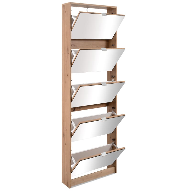Jalanõudekapp on valmistatud kvaliteetsest artisan tamme imitatsiooniga puitlaastplaadist. Kapil on 5 peegliga klappust jalanõude jaoks. Kapp mahutab umbes15 paari jalanõusid.