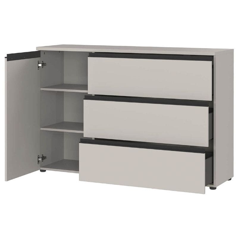 Kogu sarja mööbel on valmistatud melamiinkattega mööbliplaadist ning on kivihalli viimistlusega. Kummutil on ühe ukse taga kaks vaheriiulit, kolm sahtlit liiguvad mugavalt metallsiinidel.