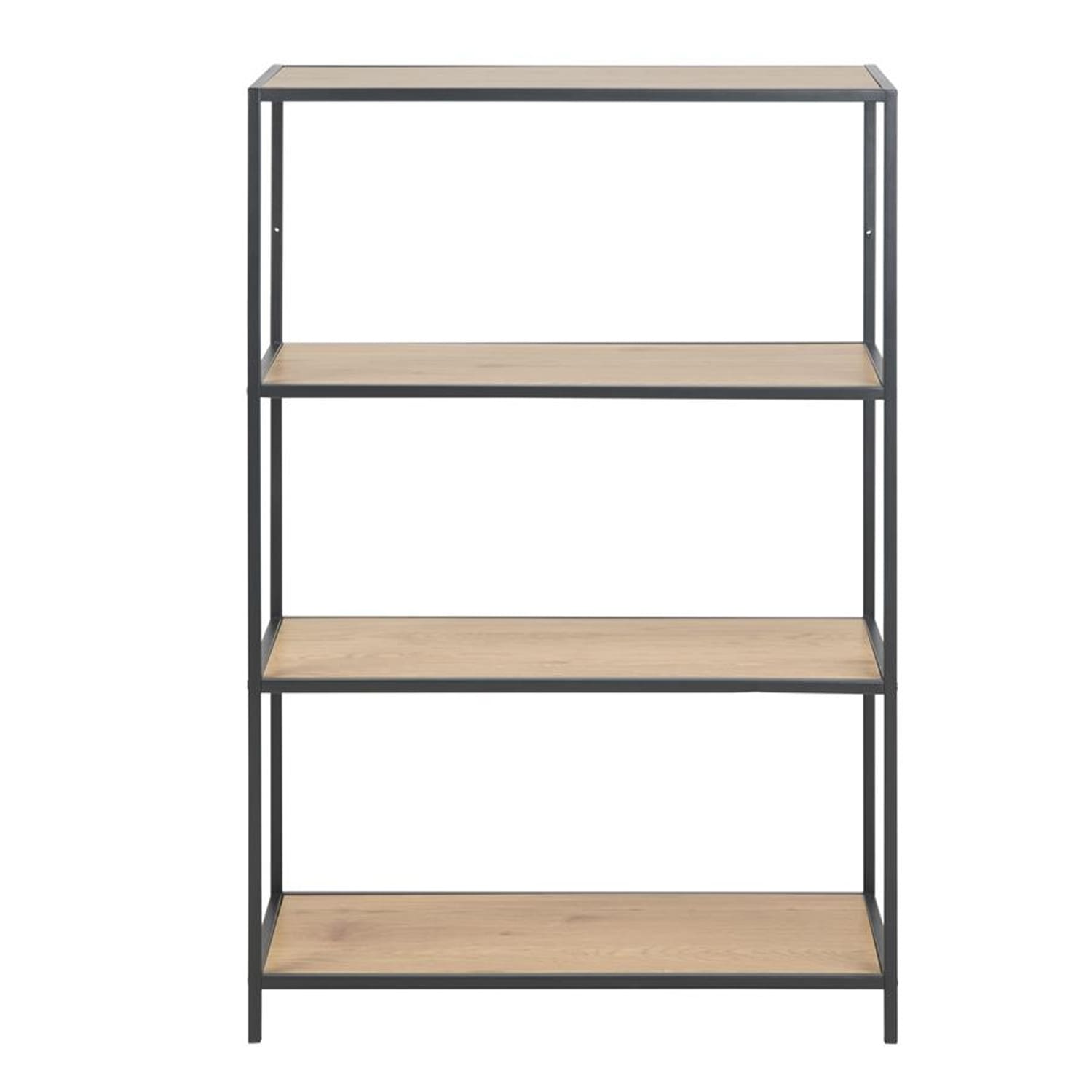 Raamaturiiul on ruumikas ja minimalistlik, kuid siiski huvitava disainiga. Raam on valmistatud mustast pulbervärvitud metallist. 3 metsiku tamme värvi riiulit tekitavad maalähedase tunde. Riiulid on valmistatud lamineeritud kattega mööbliplaadist. Tagasihoidlik riiul sobib kergesti paljudesse interjööridesse. Isikupärase ja moodsa atmosfääri loomiseks asetage riiulile oma lemmikesemed. Mõõdud on 77x35xH114cm.