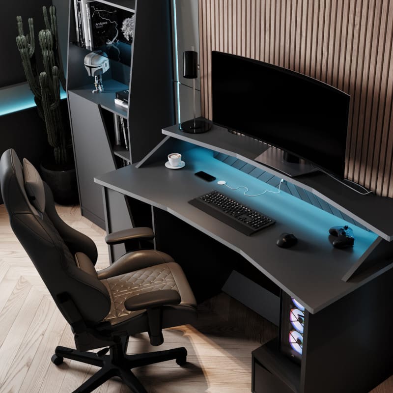 Riiul on valmistatud mööbliplaadist ning on mustas toonis. Riiuliga tuleb kaasa ka LED valgustus. Sobib ideaalselt täiustama sama sarja mängurilauda.