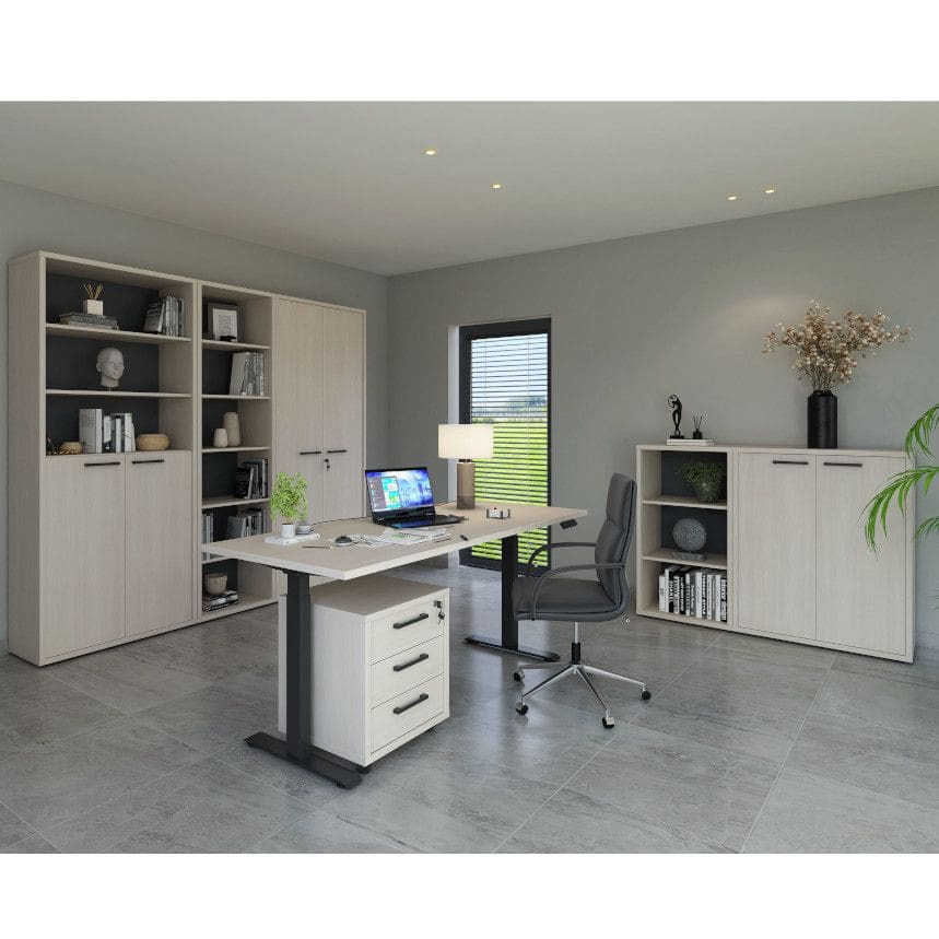 Flexo kontorimööbli sari on loodud kontoriruumide efektiivseks ja paindlikuks kujundamiseks. Sari pakub laia valikut kappe, sahtlibokse ja reguleeritava kõrgusega töölaudu, võimaldades luua kohandatud ja individuaalseid kontorilahendusi.