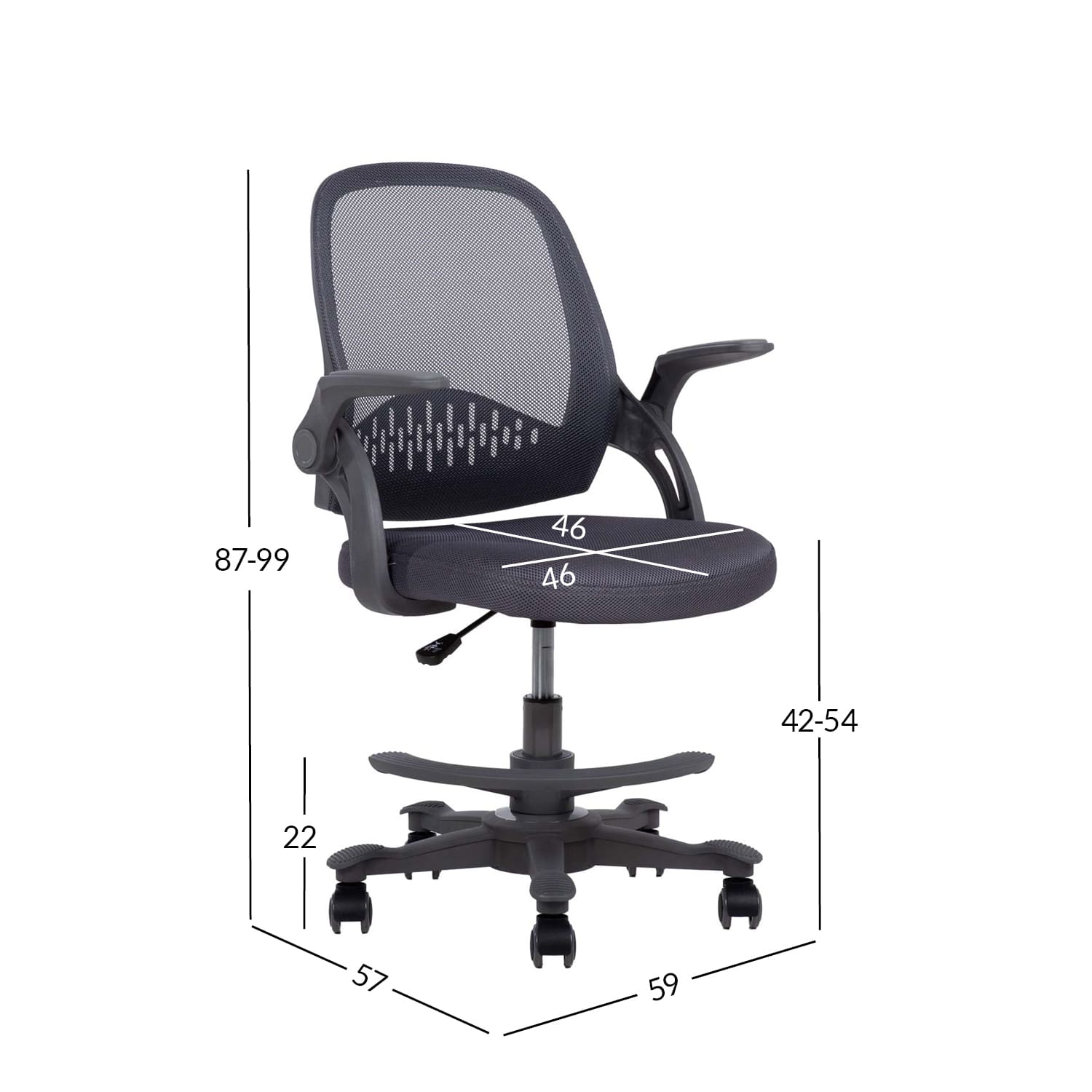 Tooli üldmõõdud: 59 x 57 x H87 – 99 cm. Istme laius 46 cm, istme sügavus 46 cm, istme kõrgus 42 – 54 cm. Jalatoe kõrgus maast 22 cm.