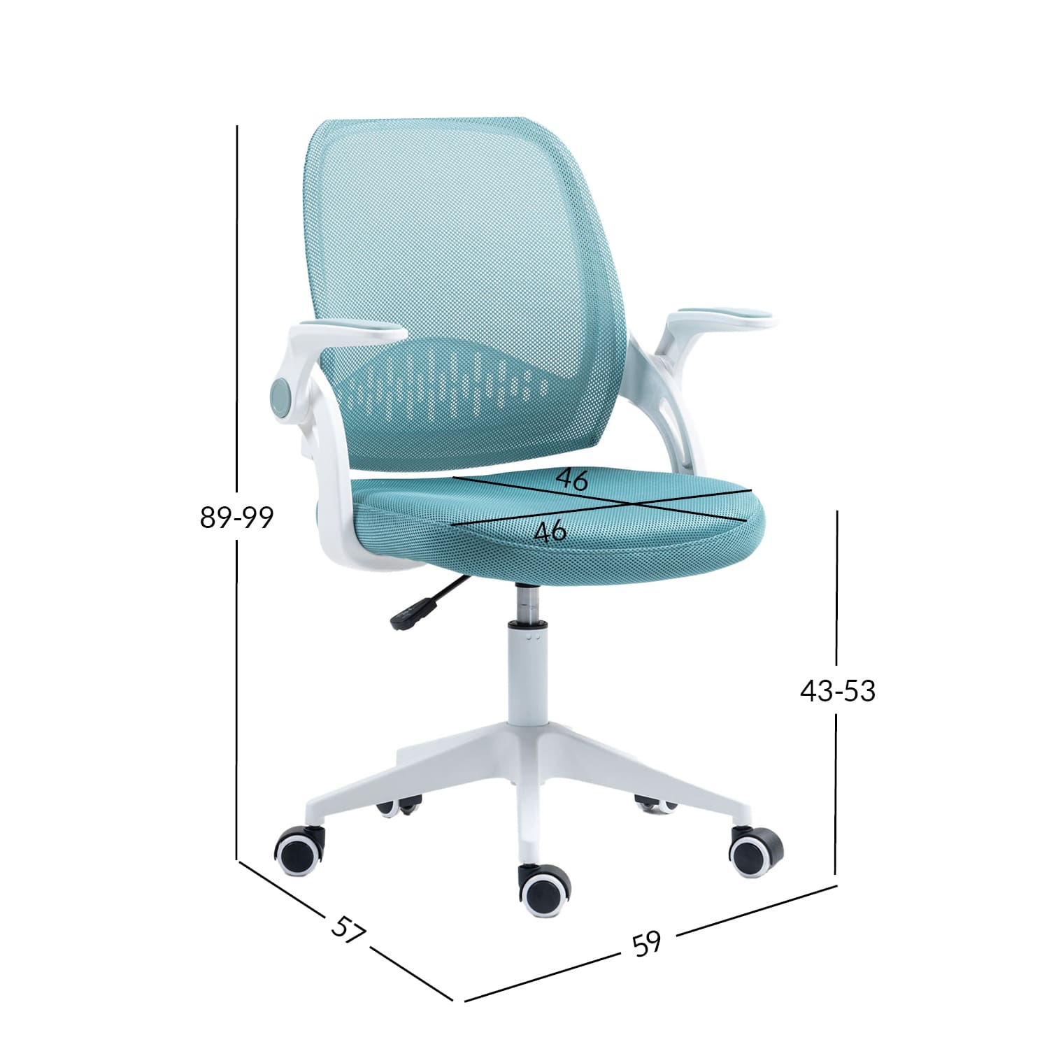 Tooli üldmõõdud: 59 x 57 x H89 – 99 cm. Istme laius 46 cm, istme sügavus 46 cm, istme kõrgus 43 – 53 cm.