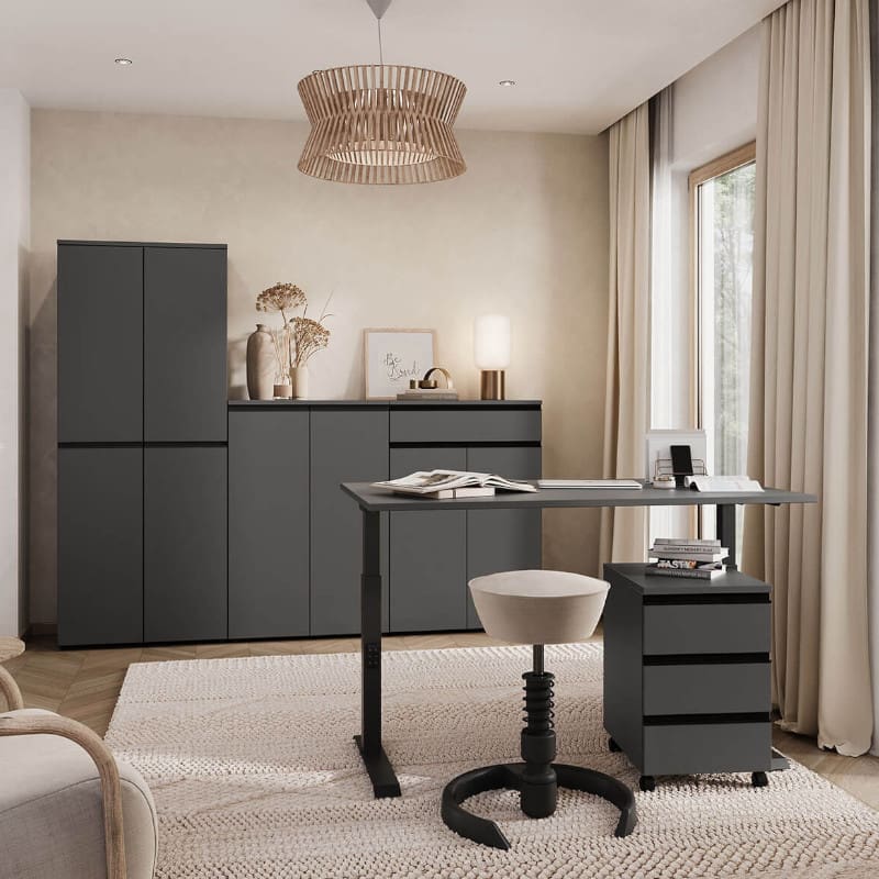 Bedano mööblisari on ideaalne lahendus nii kontorisse kui ka kodukontorisse, luues praktilise ja hästi organiseeritud töökeskkonna. Selle funktsionaalne disain tagab mugava ja tõhusa tööruumi, kus kõik vajalik on käeulatuses. Sarja viimistlusvalik hõlmab nii sooja kašmiiritooni kui ka modernset grafiiti, pakkudes võimalust leida just sinu interjööriga sobiv lahendus.