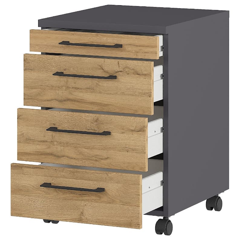 Sahtliboks on valmistatud melamiinkattega mööbliplaadist. Sellel on neli sujuvalt liikuvat metallsiinidel sahtli pakkudes täiendavat ruumi isiklikele esemetele ja dokumentidele. Lisaks on sahtliboks varustatud ratastega, mis võimaldavad selle kergesti ümber paigutada vastavalt vajadusele.