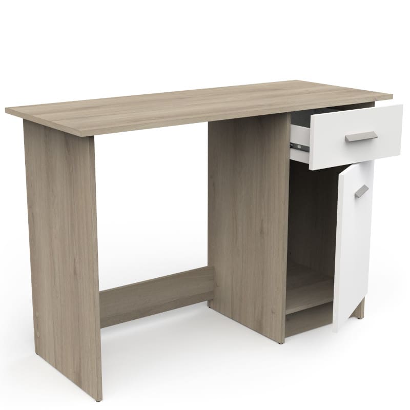 Kirjutuslaua vastupidavuse tagab kvaliteetne mööbliplaat. Lauaplaadi maksimaalne kandevõime on kuni 30 kg. Laua kolm üks sahtel liigub mugavalt metallsiinidel. Uks taga riiulita hoiuruum.
