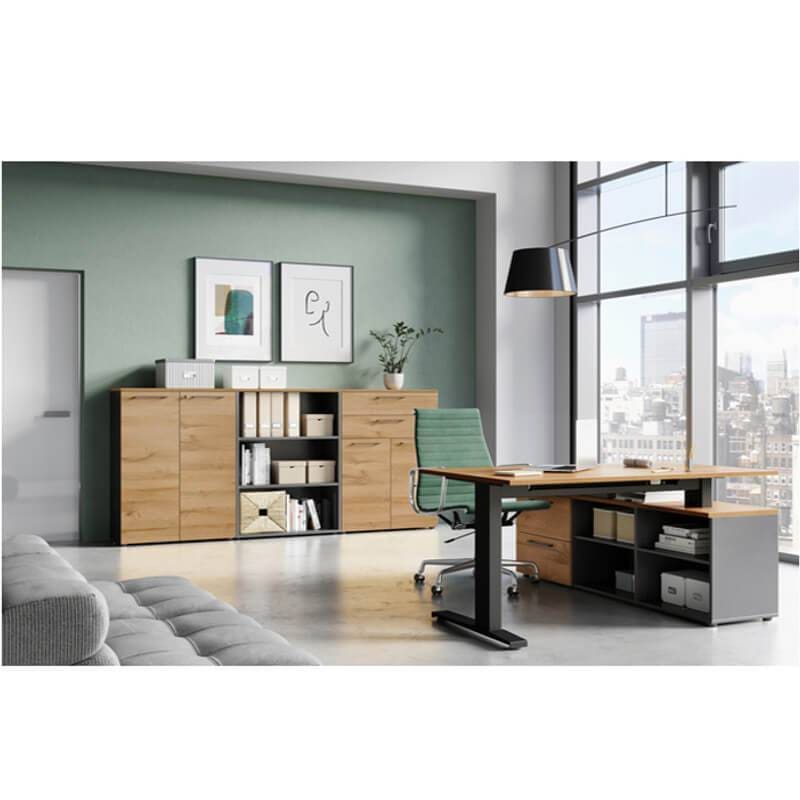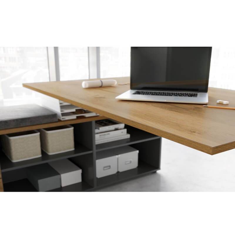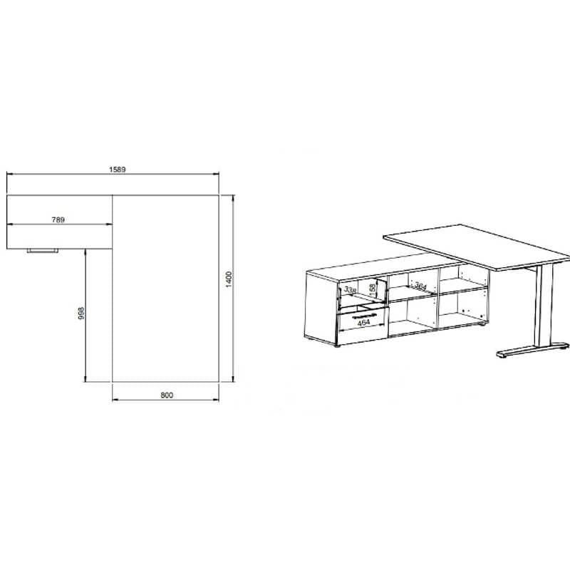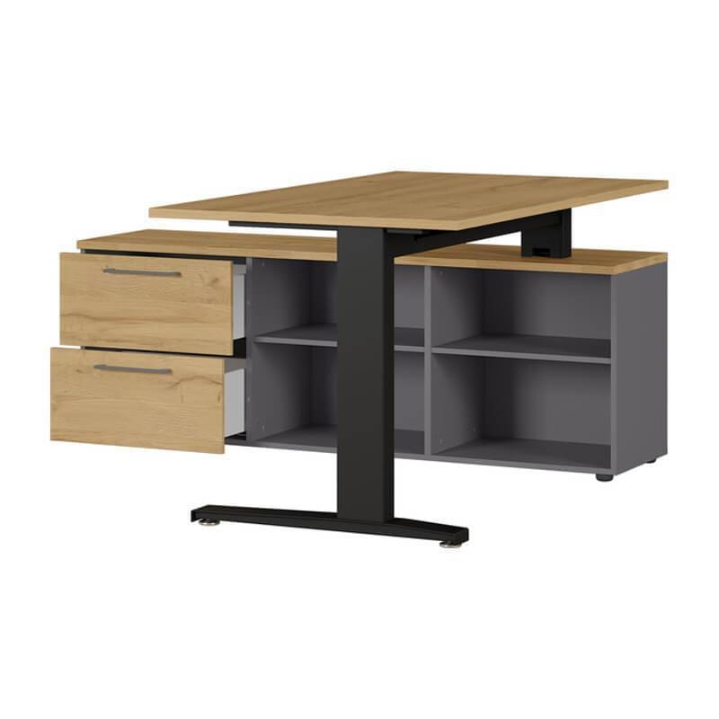 Töölaua jalad ning raam on valmistatud vastupidavast metallist ja viimistletud musta tooniga ning plaat ja sahtlid on valmistatud melamiinkattega puitlaastplaadist. Nurgalaual on kvaliteetsed ABS servad. Nurgalaual on neli avatud riiuliosa ning kaks sahtlit, mis liiguvad mugavalt metallsiinidel. Sahtlid on isesulguvad. Laud on monteeritav mõlemat pidi, kuid kui laud juba on kokku pandud, siis teisiti enam monteerida ei saa.