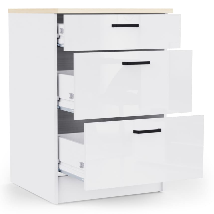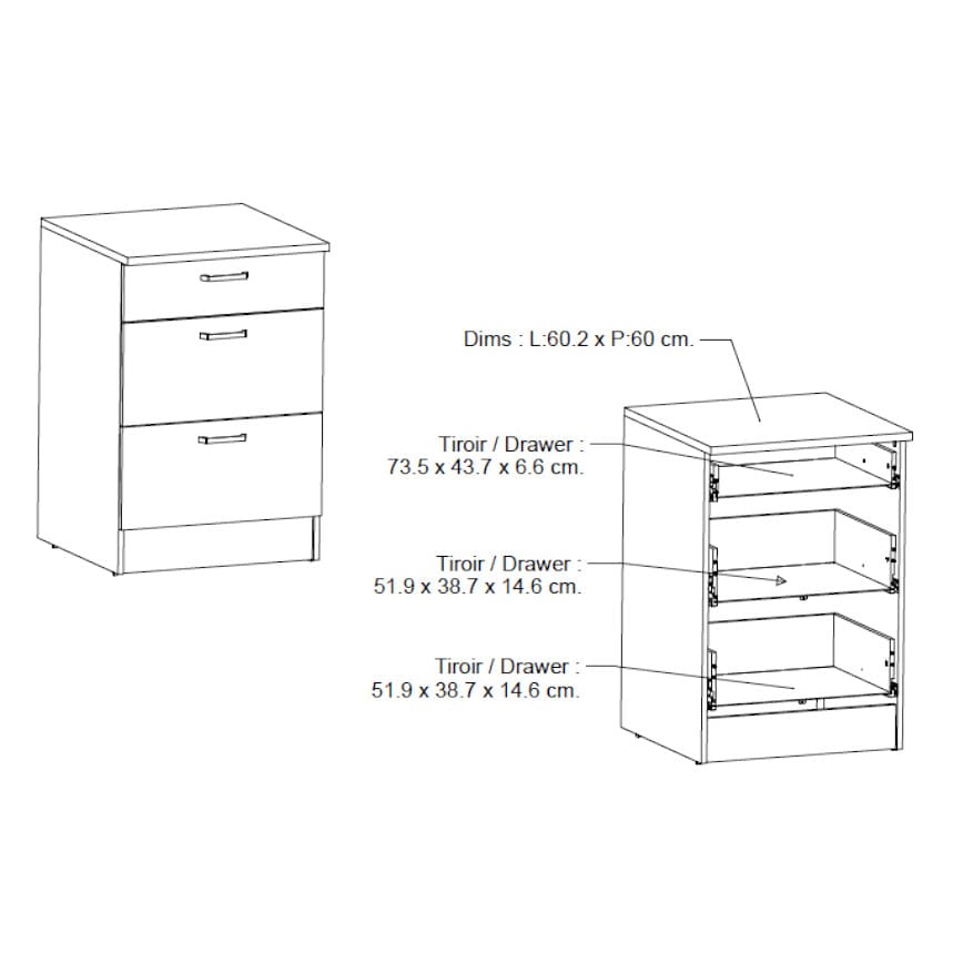 Kolme sahtliga alumine köögikapp on valmistatud kvaliteetsest melamiinkattega mööbliplaadist, mis on niiskus- ja kriimustuskindel. Pealmine plaat tamme imitatsioonis ning sahtlitel valge kõrgläige. Sahtlid liiguvad metallsiinidel.
